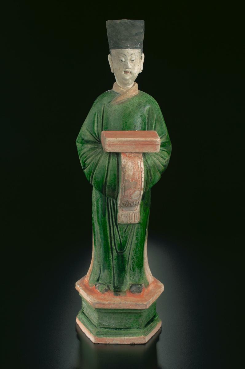 This standing figure wears a long, flowing robe with hands hidden in the folds of his wide sleeves. The body is lacquered and painted with designs in red pigments. The figure probably represents a male attendant and served as burial ware or ‘mingqi'. The custom of burying objects with the deceased stems from the belief in life after death.