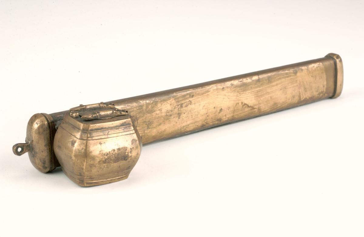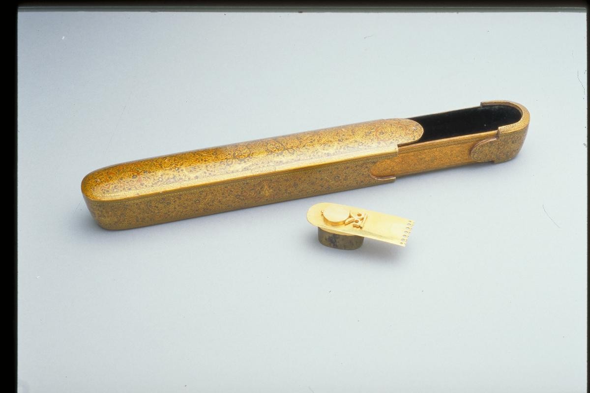 The top of this lacquered pen box is decorated with floral designs in red and brown, and the sides with marbled effect. Lacquer was very popular in Iran during the Qajar period (1779-1925), and was used to decorate pen boxes and mirror-cases. This box would have been used to store the reed pen or other writing implements.