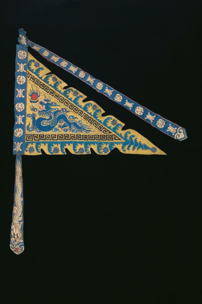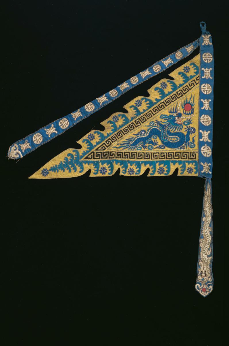 A yellow embroidered triangular pennant worn by a ‘wu sheng’ in a Chinese opera