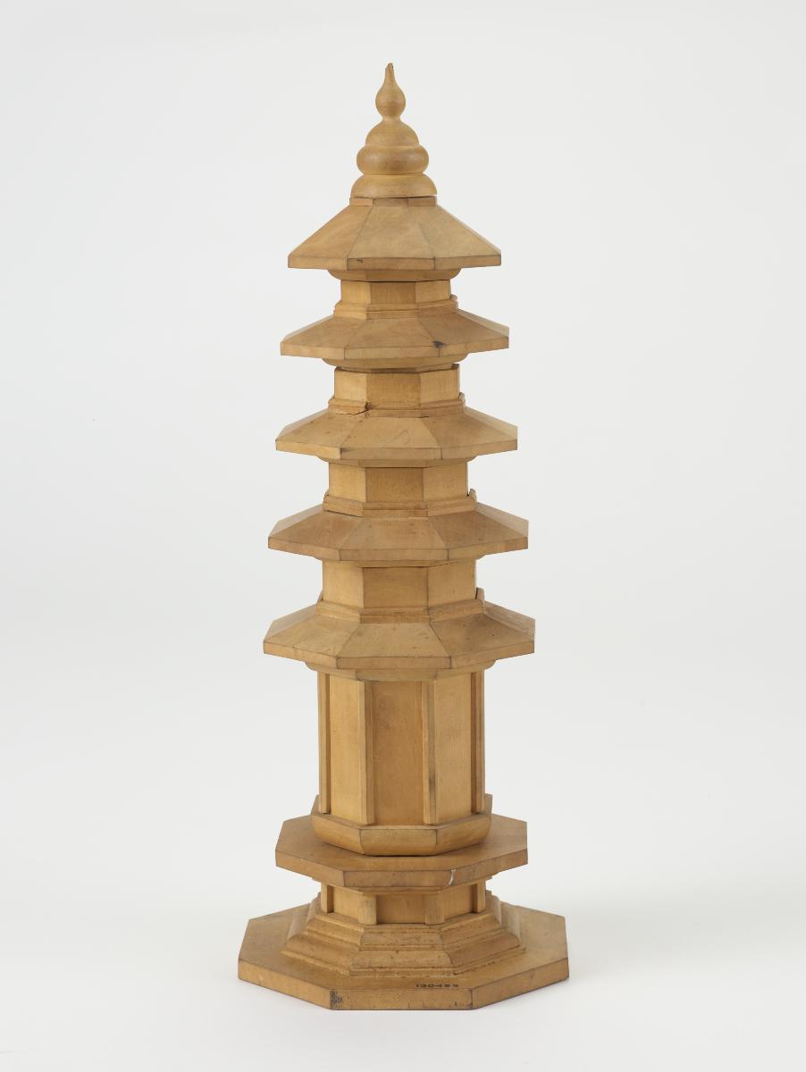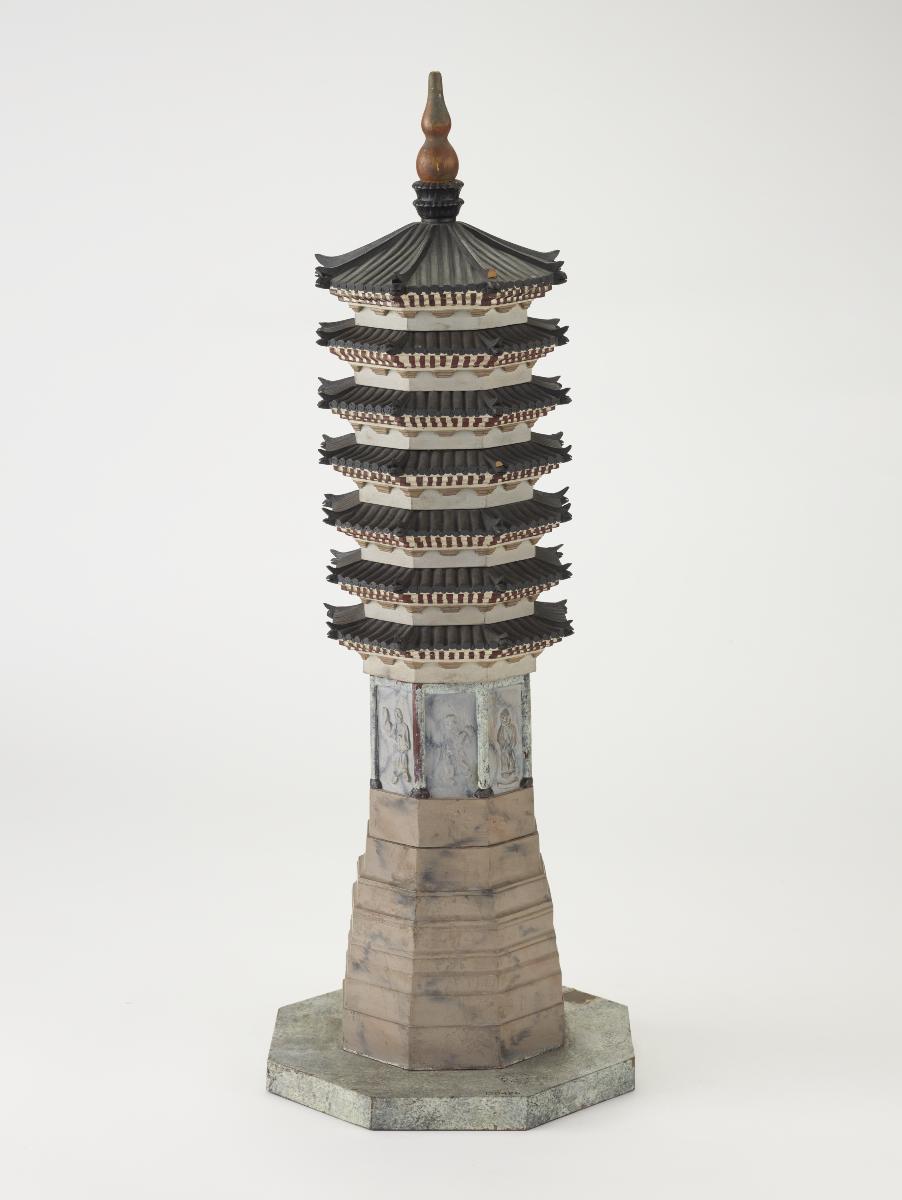 This model pagoda would have been part of a group of Ming tomb furnishings. It is decorated with green and amber lead glazes which are typical ‘sancai’ colours. The practice of using lead-glazed burial wares had already started during the Han dynasty (206 BCE-220 CE). This glaze technology further developed during the Tang dynasty (618-906) into ‘sancai’ (‘three-colour’) glaze. It included colours such as cream, amber, brown and blue. The glaze tradition continued into the Ming period.The custom was an ancient one. It is thought these wares were necessary to the deceased in the next world. Elaborate groups of burial wares were also a display of wealth and social status.