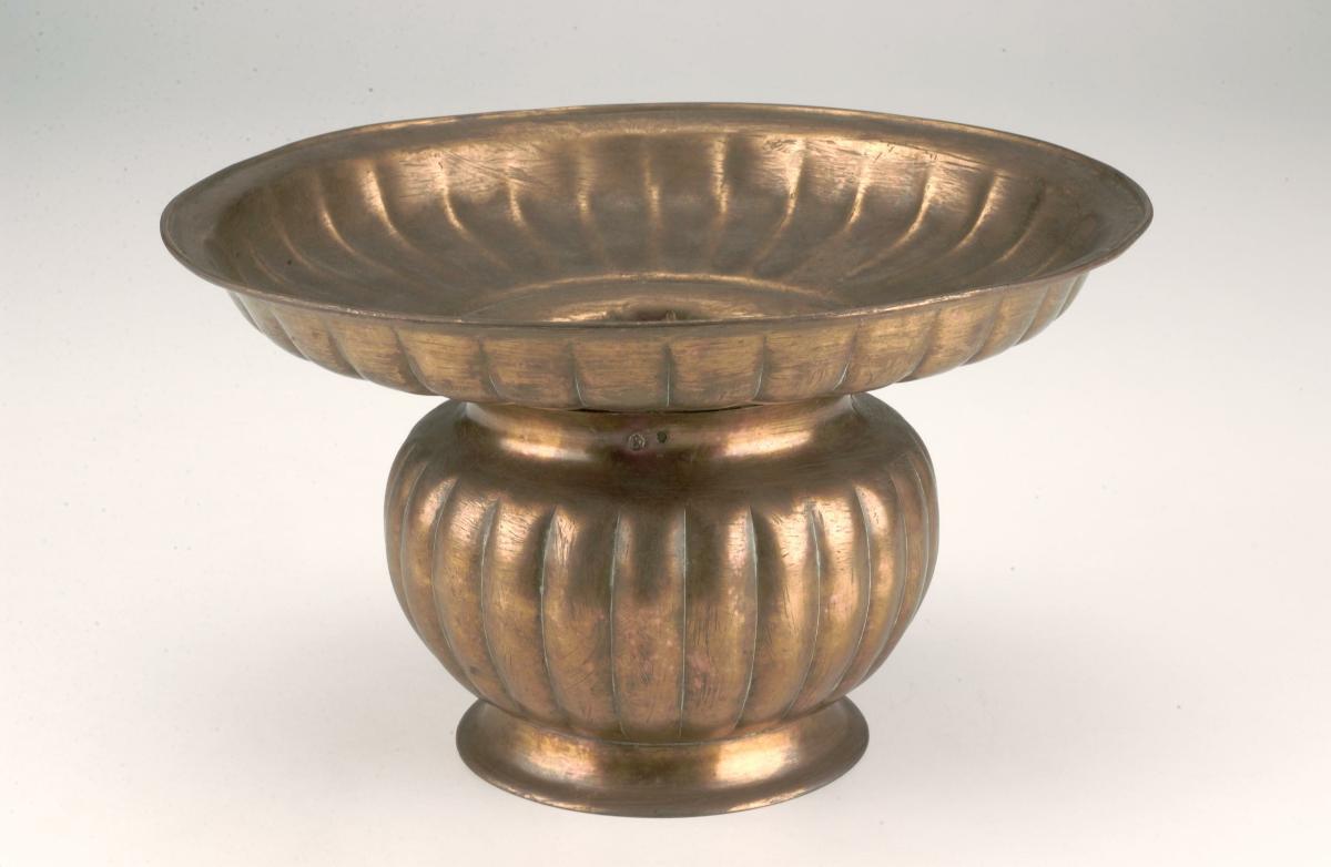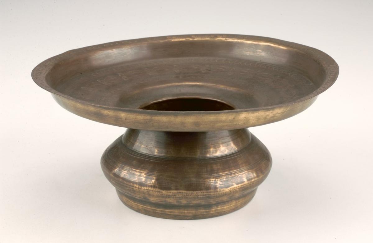 This water jar and basin have no discerning decorations which suggest that the emphasis was more on the functional shape of the object rather that then on the decorative pattern.The most common decorations on Malay brassware tend to be floral and vegetation within geometric or calligraphic motifs. These motifs were either engraved or embossed onto the object.