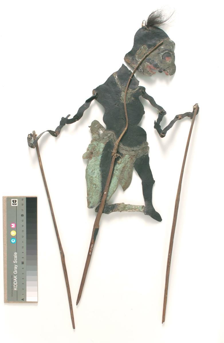 This puppet represents a clown or servant and appears alongside many other characters in the Javanese 'wayang kulit' or leather shadow puppet theatre tradition.The vast majority of the 'wayang' plays performed are drawn from the two great Hindu epics, the Ramayana and the Mahabharata as well as local stories of Javanese origin. 'Wayang kulit' is considered the highest of the Javanese performing arts. Performed in the royal courts of Java as early as the ninth century, this tradition continues to be treasured as one of the 'pusaka' or sacred heirlooms of the court. 'Wayang kulit' is traditionally performed on ritual days and religious ceremonies. It has also been adapted more recently for television and public education campaigns.