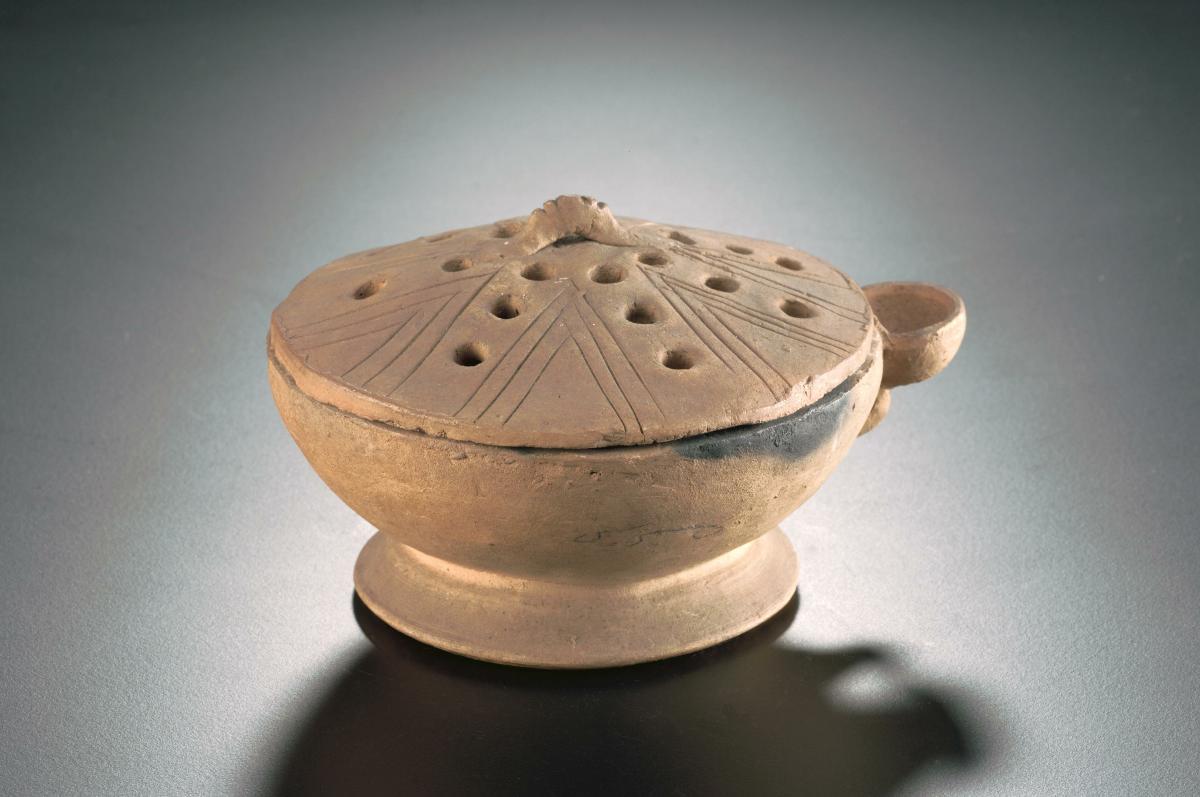 This cone-shaped lid is decorated with openwork ornamentations. It may have been used as a lid for an incense burner.