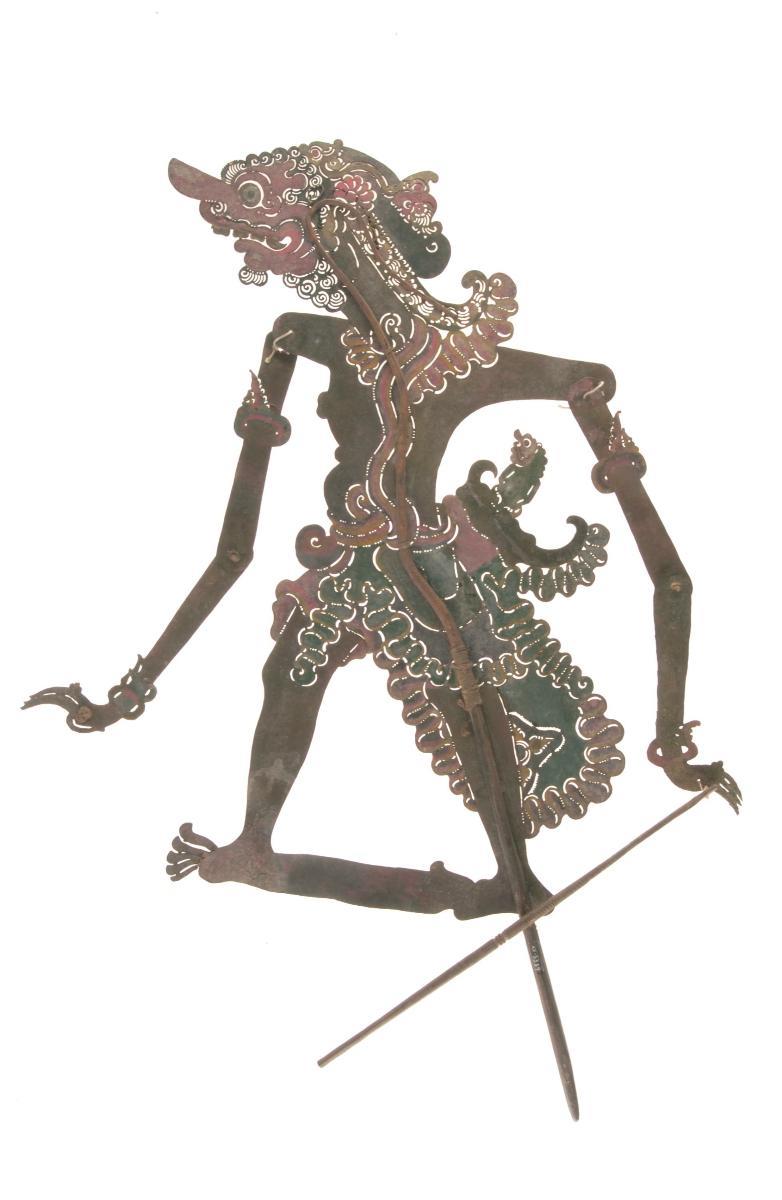 This puppet represents the character Burisrawa (Bhurisrava) from the Hindu epic, the Mahabharata. He is he king of Mandraka and an ally of the Korawa (Kaurava) family. He is a bold and haughty character as reflected in his round eyes and wide stance.The Mahabharata relates the conflict and struggle between two sets of cousins, Pandawa (Pandava) and Korawa , over the rule of the kingdom of Astina (Hastinapura). The Pandawa brothers eventually overcome the Korawa in the Great War, the Bharatayuda. The vast majority of the 'wayang' plays performed are drawn from the two great Hindu epics, the Ramayana and the Mahabharata as well as local stories of Javanese origin. 'Wayang kulit' is considered the highest of the Javanese performing arts. Performed in the royal courts of Java as early as the ninth century, this tradition continues to be treasured as one of the 'pusaka' or sacred heirlooms of the court. 'Wayang kulit' is traditionally performed on ritual days and religious ceremonies. It has also been adapted more recently for television and public education campaigns.
