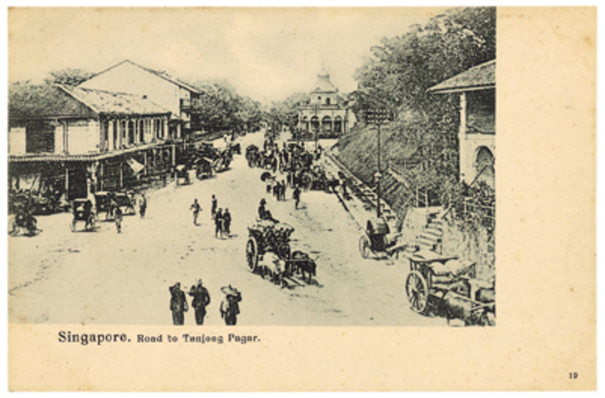 This road leads to the dock area, with the dome of the Tanjong Pagar Police Station standing out prominently in the background of this postcard. Built in 1890, the station was later demolished in 1983 to make way for the expansion of the Tanjong Pagar Container Terminal.