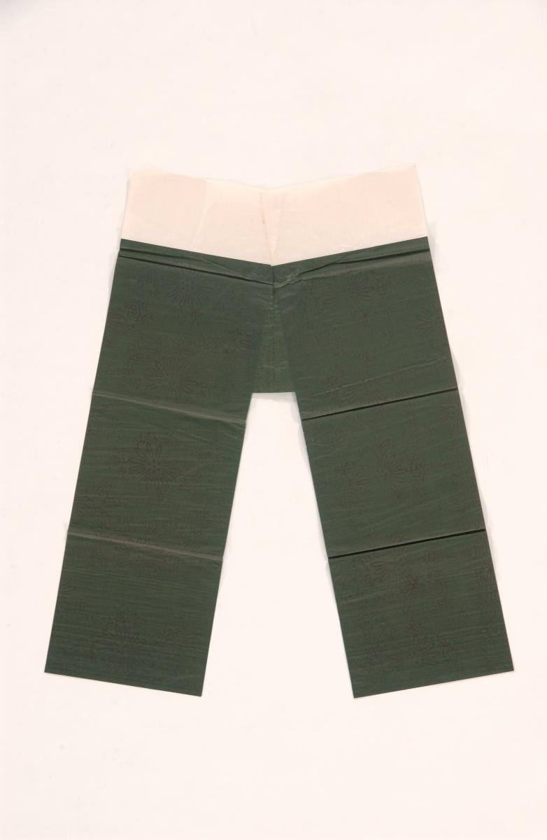 This pair of drawstring pants is worn with a matching blouse. The style of the pants reflects the 1970s’ preference for bold and loud designs.