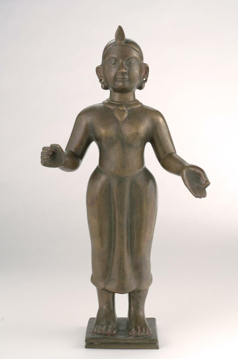 This figurine of Mother Goddess is stylistically close to the Harappan period figurines. Sharing similar broad hips, stunted legs and hands, summary face, coarsely applied ornaments and highly floral head ornaments. It is noteworthy that Mother figures and nature goddesses have been represented on Indus seals, as three dimensional objects and as relief sculptures all the way through Mauryan, Shunga (4th-2nd centuries BCE) and Kushana (1st-3rd centuries CE) periods. This Mauryan period mother goddess figurine is made of a different type of clay and technique.