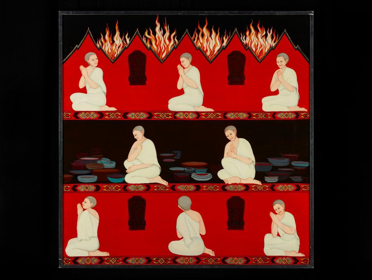 This is the letter 'nun' (N) in the Arabic alphabet hand-painted using acrylic paint on canvas. The artist, Ali Hassan, focuses on single letters believing that they provide a better means of expressing the flexibility, versatility and vitality of the Arabic script and language. He chose the letter 'nun' (N) because of his fascination with it, its mathematical properties and significance in the Qur’anic chapters.