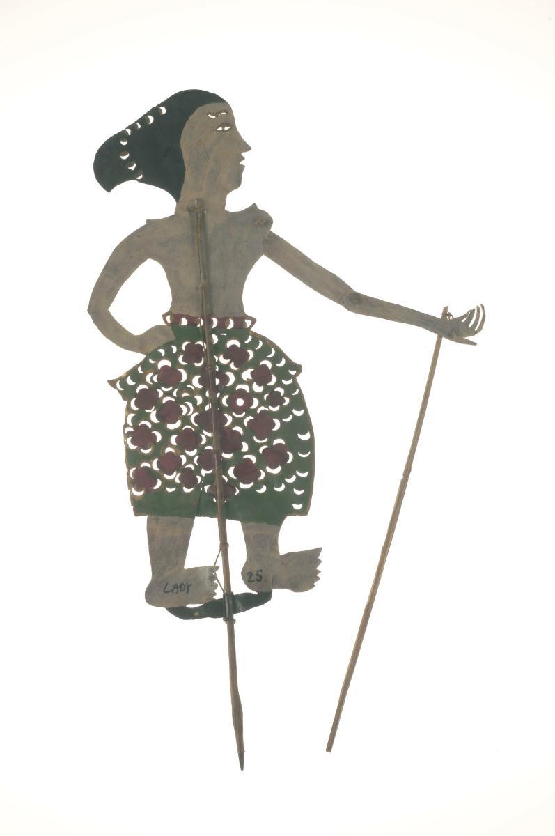 This puppet represents the character of a lady-in-waiting in the Javanese 'wayang kulit' or leather shadow puppet theatre tradition.The vast majority of the ‘wayang’ plays performed are drawn from the two great Hindu epics, the Ramayana and the Mahabharata with as well as stories of Javanese origin. 'Wayang kulit' is considered as the highest of the Javanese performing arts. Performed in the royal courts of Java as early as the ninth century, this tradition continues to be treasured as one of the ‘pusaka’ or sacred heirlooms of the court. 'Wayang kulit' is traditionally performed on ritual days and religious ceremonies. It has also been adapted more recently for television and public education campaigns.