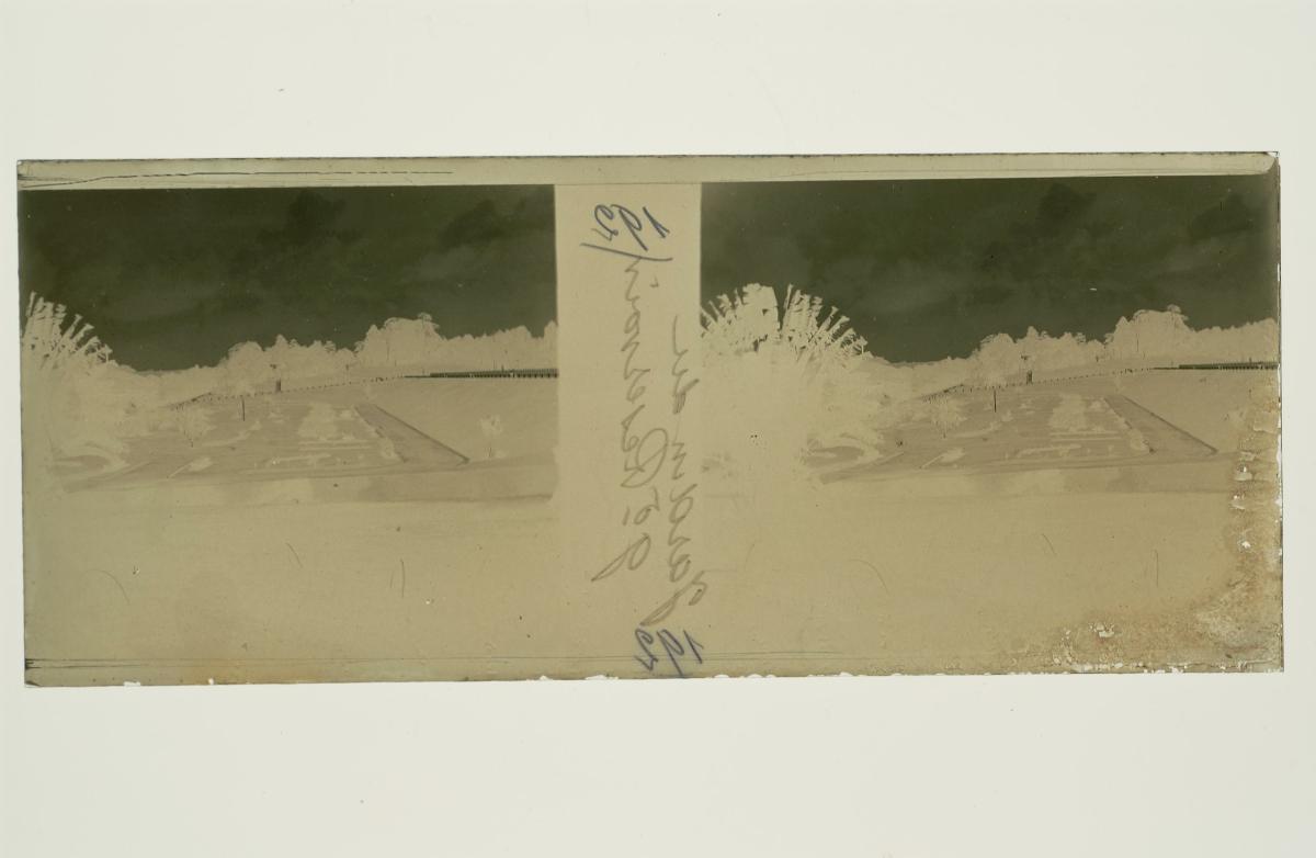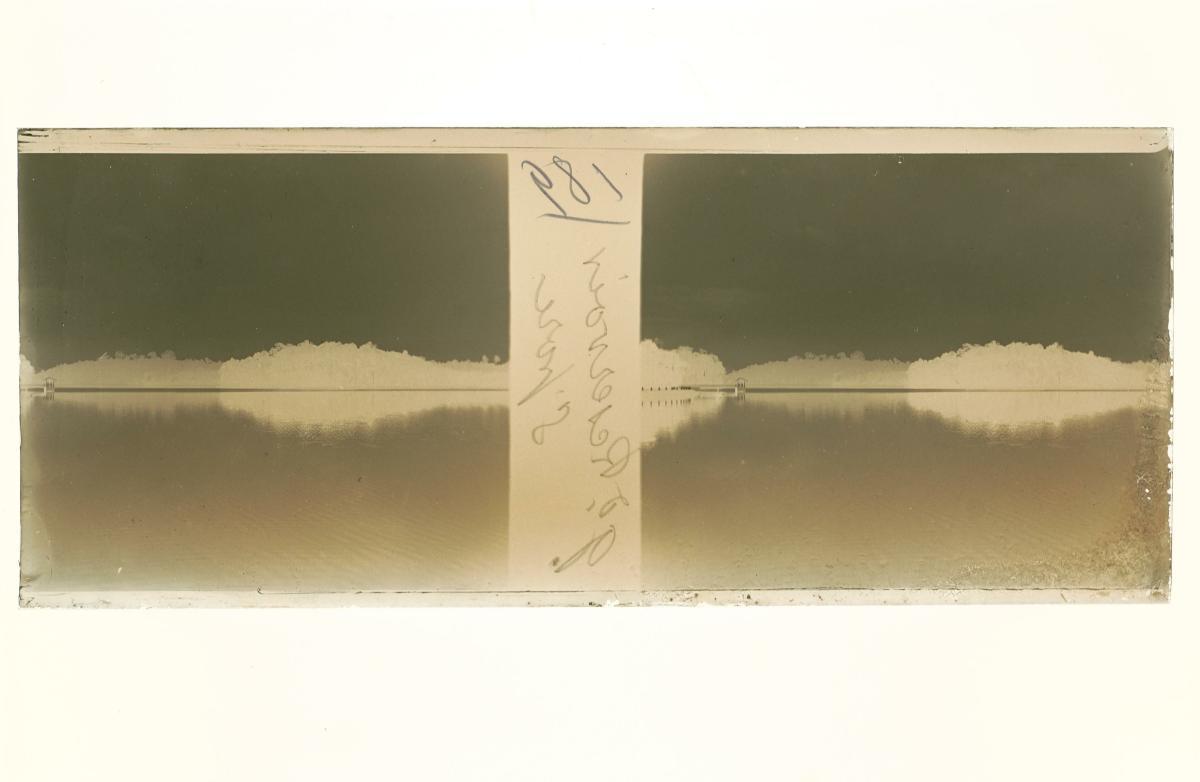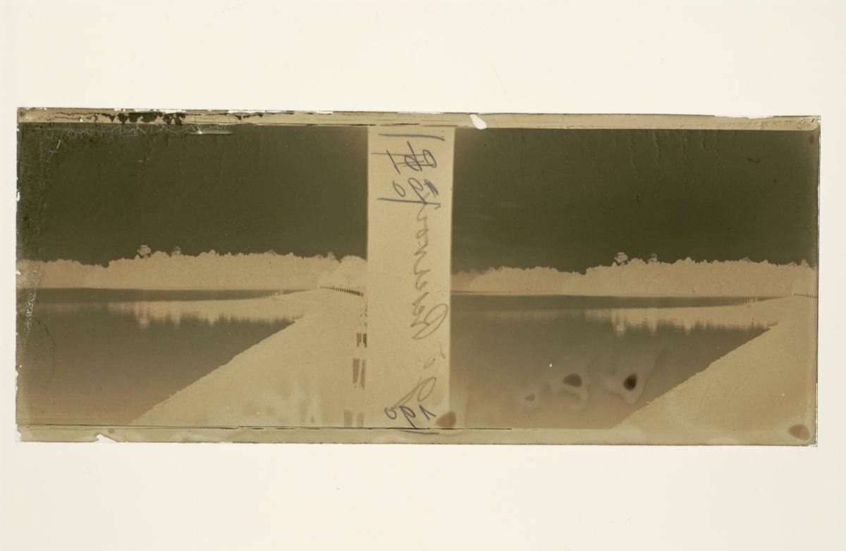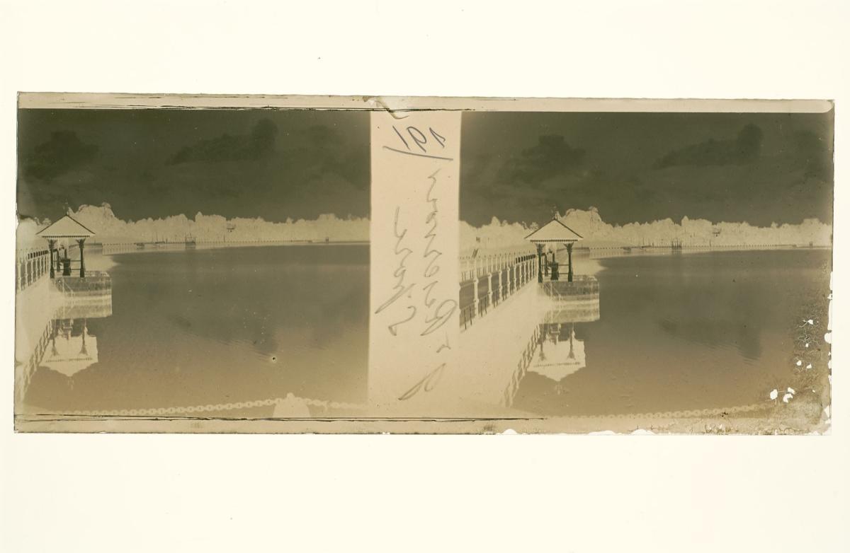 This is a glass stereoscopic slide from the H. Schaefer Collection showing a reservoir in Singapore.