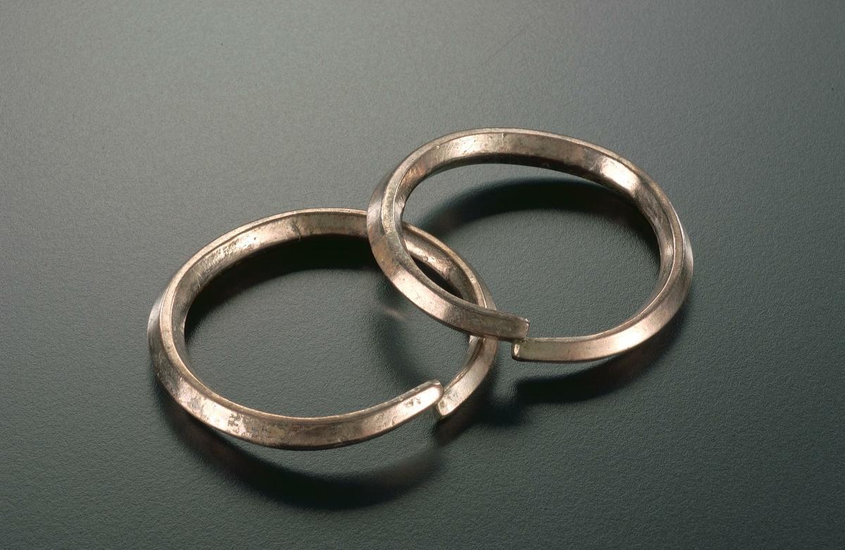 This pair of bracelets are decorated with leaves of incised lines. They were worn by unmarried women.