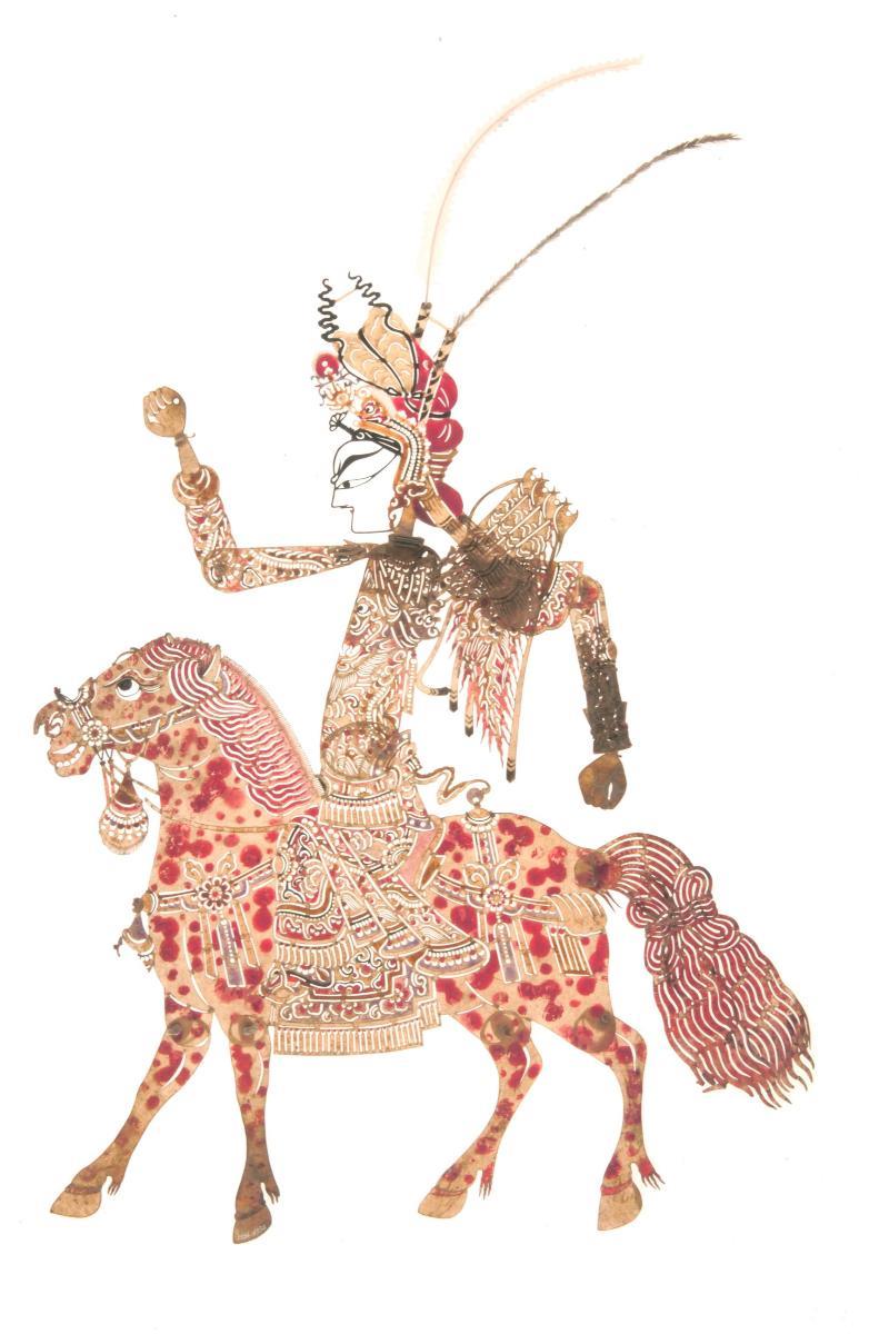 This shadow puppet appears alongside characters from wayang stories that include the Hindu epics, the Ramayana and Mahabharata. These epics are among the popular wayang stories performed in the Javanese 'wayang kulit', or leather shadow puppet theatre tradition.Wayang kulit is considered the highest of the performing arts. Performed in the royal courts of Java as early as the ninth century, this tradition continues to be treasured as one of the pusaka or sacred heirlooms of the court. Wayang kulit is traditionally performed on ritual feast days and religious ceremonies. It has also been adapted for television and public education campaigns.