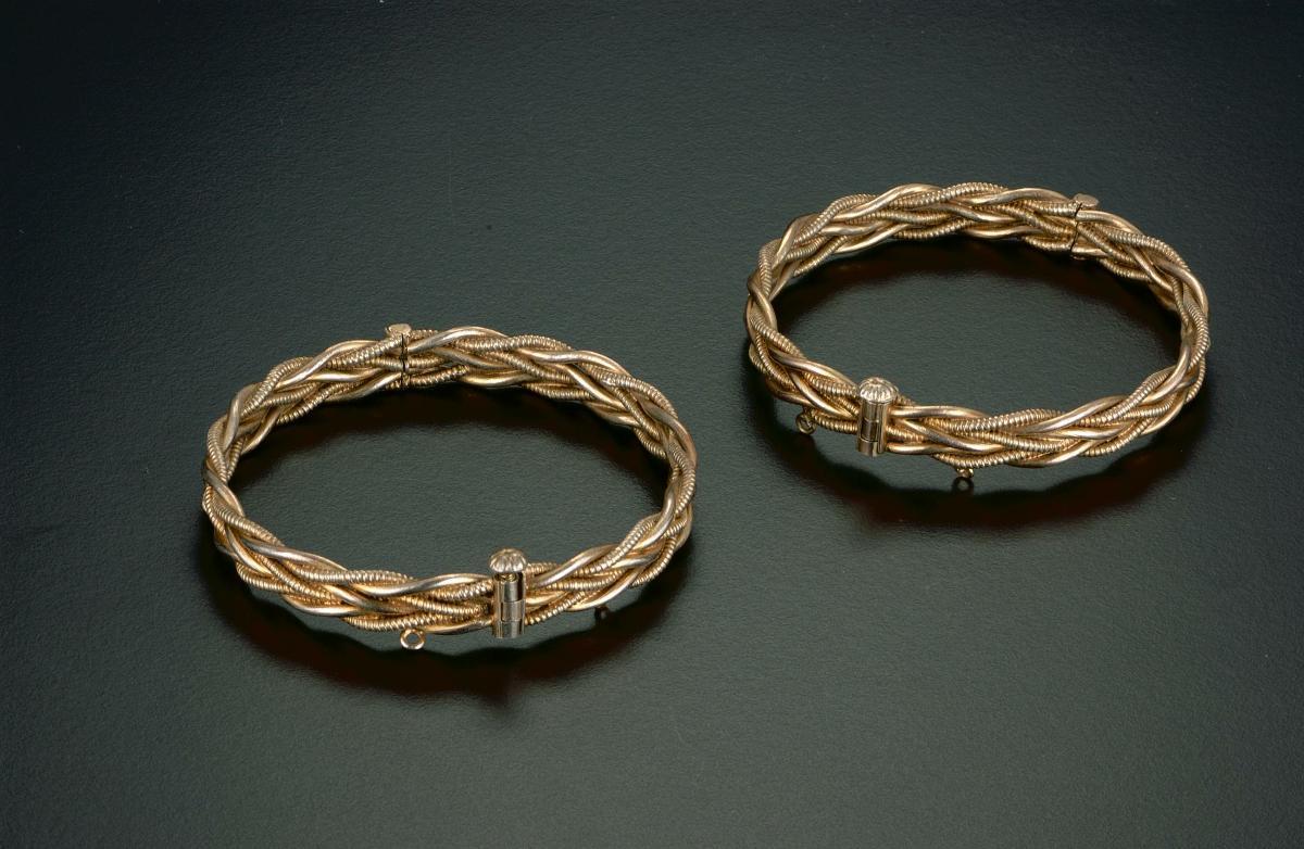 Bracelets and anklets are usually made of two sections clasped together at two joints with one of these serving as the opening. They consist of several pieces of silver soldered together and are often hollow. This pair of gilded silver bangles represent costume jewellery for a Sumatran bride. It is made using repoussé and filigree techniques.