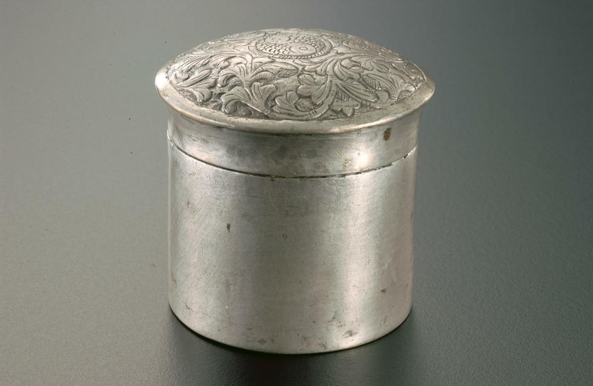 Betel nut sets were usually equipped with several implements to help prepare a betel quid. A set generally comprises a receptacle for holding betel leaves, an areca nut pounder, boxes for betel and tobacco, pots for storing 'gambier' (lime) such as this example, and a piece of 'songket' (gold brocade cloth) for wrapping other ingredients such as cloves. A betel quid consists of a thin layer of slaked lime, thin shavings of areca nut and a betel leaf.Betel chewing was practised throughout the Malay Archipelago for centuries, and was common to all social classes. The practice remained popular until the mid 20th century. People chewed betel for its mildly narcotic effects and as a social activity. Betel chewing played a vital part in every important ceremony – from weddings to funerals.