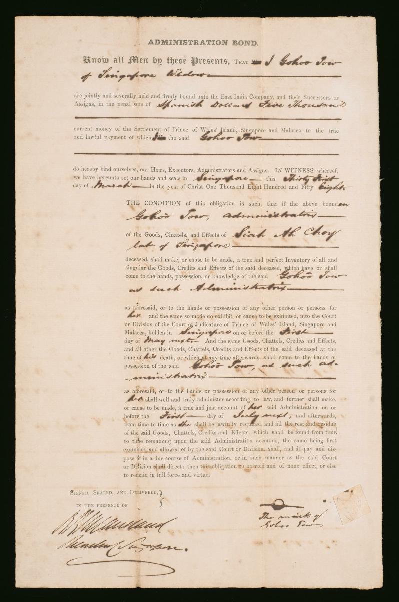 This is the petition of Gohoo Tow of Singapore concerning the administration of the estate of Siah Ah Choy. It is part of a collection of legal documents from the 19th and early 20th centuries which provides a glimpse into the work of the notable personalities who left their mark on Singapore’s legal history, and the economic and other transactions undertaken by ordinary immigrants in 19th century Singapore that tell stories of misfortune and indebtedness which would otherwise have disappeared from history.