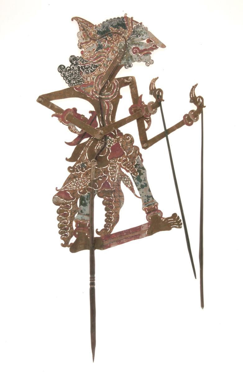 This puppet represents a warrior prince in the Javanese 'wayang kulit' or leather shadow puppet theatre tradition. His refined character is reflected in his small eyes and sharply pointed nose whilst his forward-looking gaze and wide stance indicates that he is also assertive and bold.The vast majority of the 'wayang' plays performed are drawn from the two great Hindu epics, the Ramayana and the Mahabharata as well as local stories of Javanese origin. 'Wayang kulit' is considered the highest of the Javanese performing arts. Performed in the royal courts of Java as early as the ninth century, this tradition continues to be treasured as one of the 'pusaka' or sacred heirlooms of the court. 'Wayang kulit' is traditionally performed on ritual days and religious ceremonies. It has also been adapted more recently for television and public education campaigns.