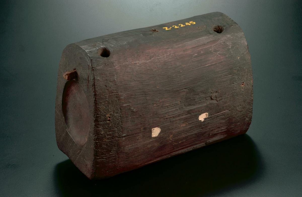 This elaborately designed bronze Buddhist ritual object consists of a 'vajra' (thunderbolt) and 'ghanta' (bell). The vajra symbolises knowledge while the ghanta stands for wisdom. It has four 'hands' in relief on the sides besides four figure heads, and four, what looks like horns with a central spike at the top. It would seem this piece is a copy of a much earlier Buddhist ritual object design, which G.B. Gardner, an early Southeast Asian explorer, collector and donor to Raffles Museum, mistook as being authentic. According to Gardner, this bronze bell was dug up near Tampin in the state of Malacca.