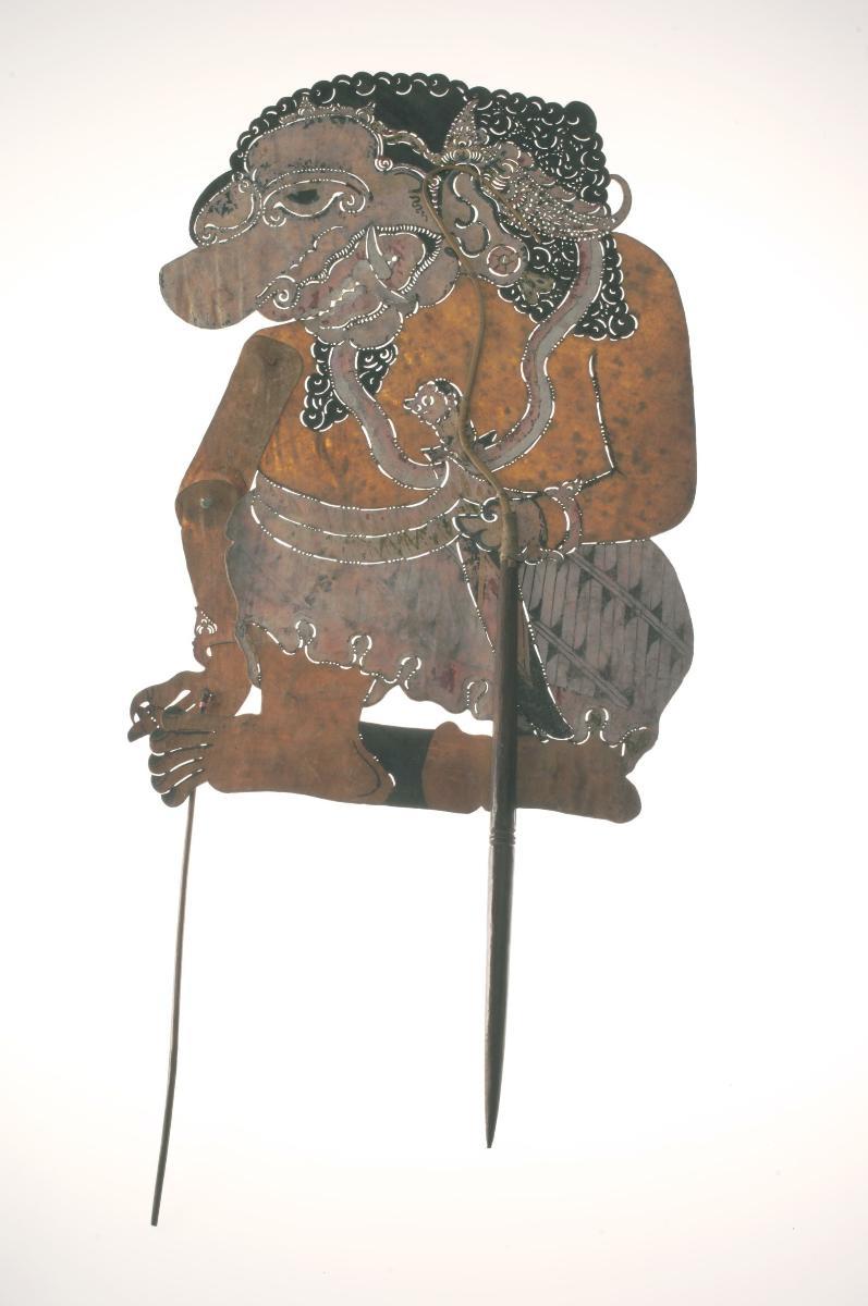 This puppet represents the character of an ogre in the Javanese 'wayang kulit' or leather shadow puppet theatre tradition. His wide-open eyes, bulbous nose, a grinning mouth revealing his incisors, reflect a typical coarse or violent character.The vast majority of the ‘wayang’ plays performed are drawn from the two great Hindu epics, the Ramayana and the Mahabharata with as well as stories of Javanese origin. 'Wayang kulit' is considered as the highest of the Javanese performing arts. Performed in the royal courts of Java as early as the ninth century, this tradition continues to be treasured as one of the ‘pusaka’ or sacred heirlooms of the court. 'Wayang kulit' is traditionally performed on ritual days and religious ceremonies. It has also been adapted more recently for television and public education campaigns.