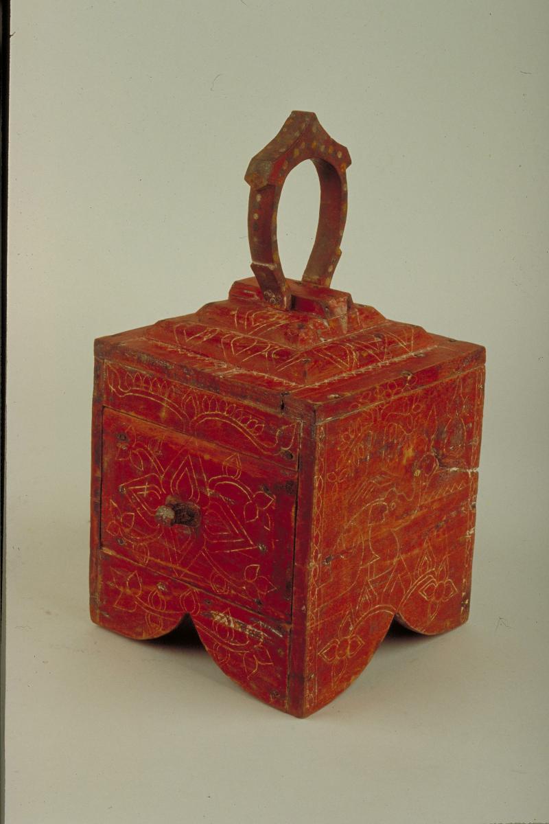 This richly ornamented box, also known as a 'cembul', refers to any circular receptacle with a tightly fitted lid or a round, globular container divided to form two tight concave parts. These small boxes were devised to hold tobacco along with sliced areca nuts so that the user did not have to carry the whole sireh set with them.Betel chewing was practised throughout the Malay Archipelago for centuries, and was common to all social classes. The practice remained popular until the mid 20th century. People chewed betel for its mildly narcotic effects and as a social activity. Betel chewing played a vital part in every important ceremony – from weddings to funerals.