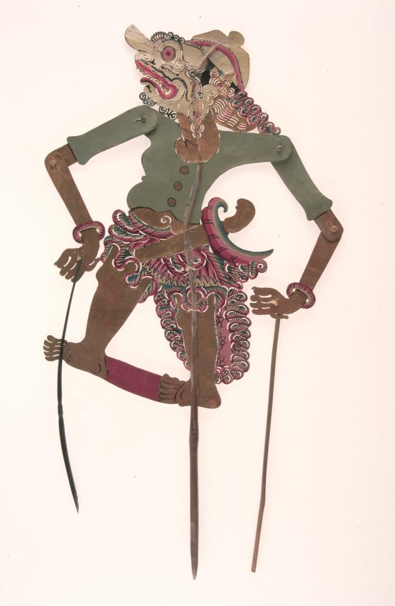 This puppet represents the character of Wahmuka in the Javanese 'wayang kulit', or leather shadow puppet theatre tradition. It is one of the many characters from the wayang stories that include the Hindu epics, the Ramayana and Mahabharata. Wayang kulit is considered the highest of the performing arts. Performed in the royal courts of Java as early as the ninth century, this tradition continues to be treasured as one of the pusaka or sacred heirlooms of the court. Wayang kulit is traditionally performed on ritual feast days and religious ceremonies. It has also been adapted for television and public education campaigns.