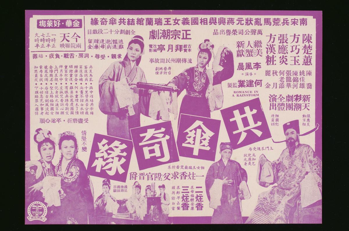 This poster was used to advertise the Teochew movie, ‘A Beauty Named Yu Mei Niang’ (余美娘, Yumeiniang), which was based on a Chinese opera.Between the 1950s and 1960s, most Mandarin, Cantonese and other Chinese-dialect movies were made in Hong Kong by film production companies with financial support from Singapore-based film studios such as Shaw Brothers, Cathay and Kong Ngee (光艺, Guanyi). These studios were also involved in the distribution and exhibition of these movies in Singapore and the rest of Southeast Asia through their network of cinemas. In the early 1970s, Mandarin movies from Taiwan became popular, but by the late 1970s, Hong Kong movies were dominant once more.
