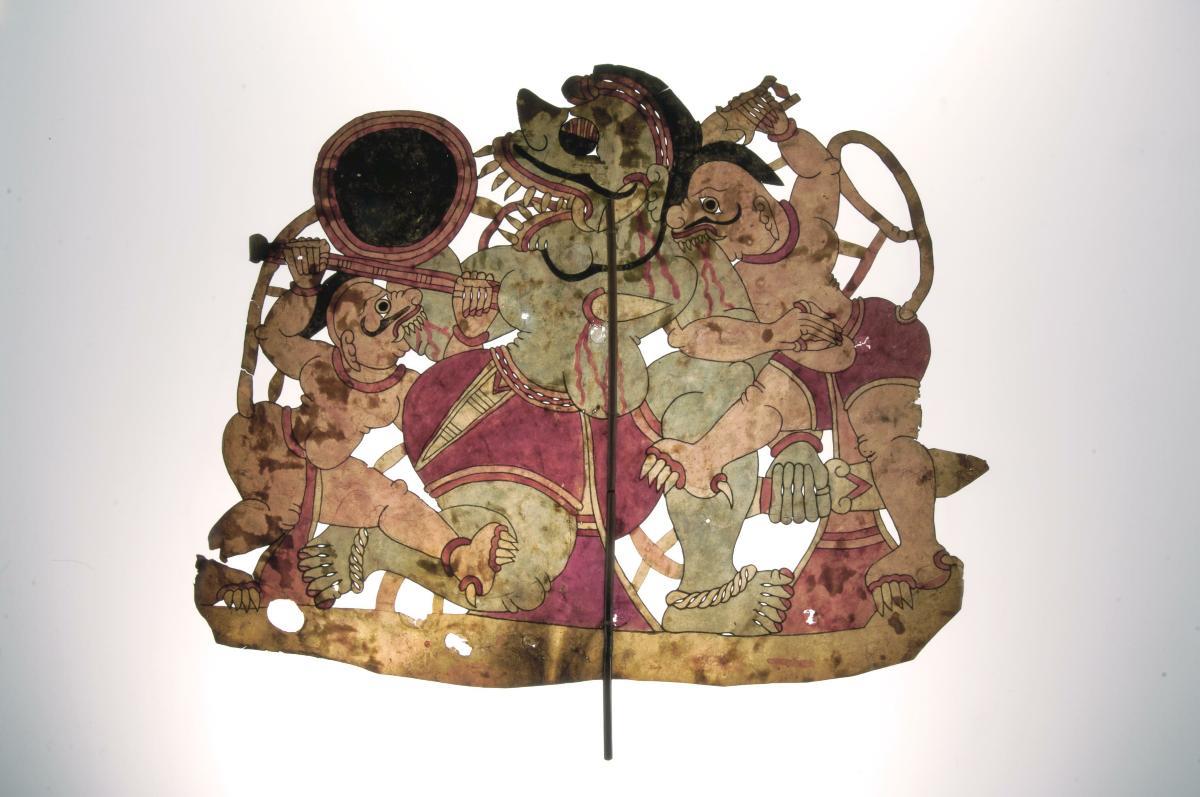 This puppet represents a goat in the ‘Wayang Siam’ or Siamese drama, a form of shadow puppet theatre in Kelantan.The principal story of the ‘Wayang Siam’ is based on one of the Malay renditions of the Hindu epic, the Ramayana known as ‘Hikayat Maharaja Wana’ (Maharaja Wana’s Tale), the other being the literary ‘Hikayat Seri Rama’ (Seri Rama’s Tale). Extensions or branch stories of the Ramayana, developed locally, were also performed.‘Wayang Siam’ was mainly performed in the villages in Kelantan. Traditionally, it was performed for ritual purposes such as the fulfilment of a vow, the initiation of a student puppeteer or for the salutations to one’s teacher. The main purpose for performance today is entertainment.
