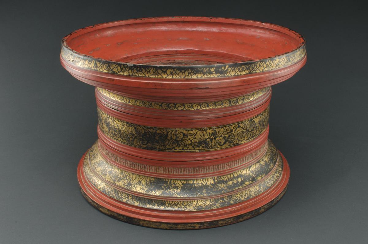 This square box has a tray with four compartments that also serves as the lid. The lateral sides are carved with fine lattice motif, goldleafed and painted with vermillion. It was used to present betel nut to guests.