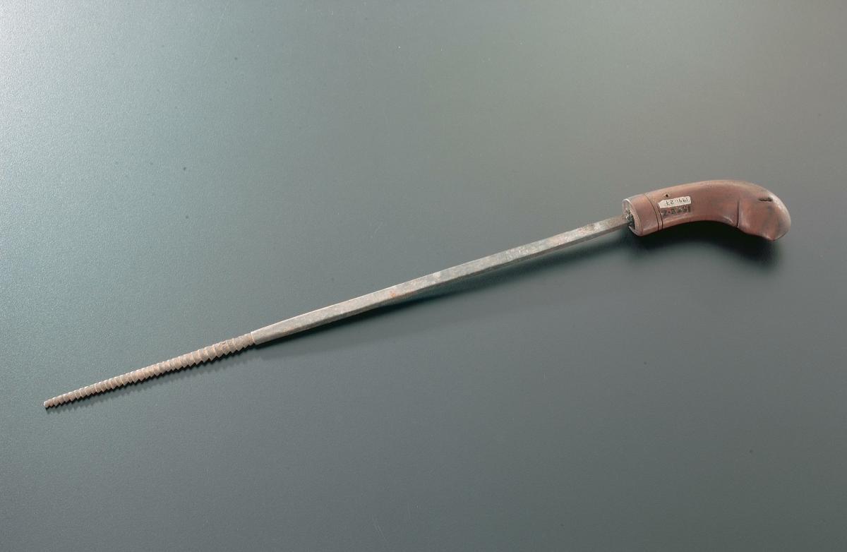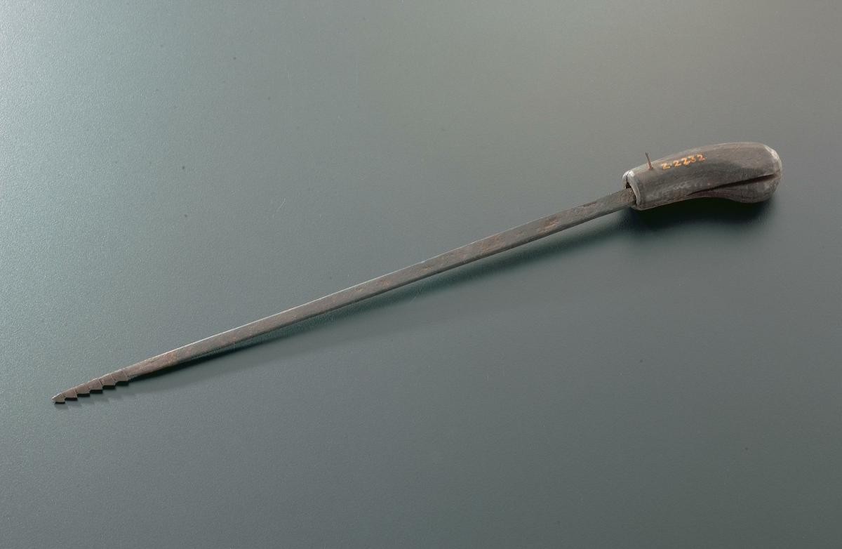 This is a saw used in the making of a keris sheath.The sheath of a keris varies from region to region. However, there is a common design among the different styles. It comprises of a large cross-piece and a stem, which makes it look like a capital T. The cross-piece is designed to take the flaring base of the keris. Sheaths are made of wood and usually wood with attractive grains are chosen. Some sheaths may be covered with metal sleeves made from brass, white metal, silver or gold. The sleeves may cover the whole of the stem or it may have a section of it cut-out to display the wood.