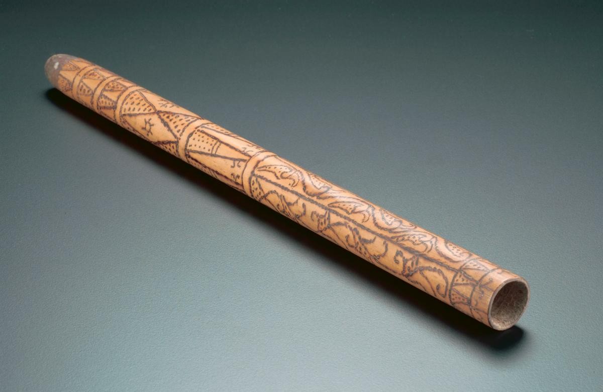This reed pipe, known as the 'sompotan', belongs to a group of musical instruments from the Raffles Museum's Borneo collection. This instrument was played either by the Dusun or the Murut communities in Sabah, who have similar cultures as they live in close proximity.It is made from dried gourd and eight bamboo pipes, arranged in a double layered raft, fitted vertically into the shell of a gourd, which functions as a sound box. The sound box of the sumpotan is now missing. The instrument is played by blowing or sucking on the gourd's mouth.It can be played as a solo instrument for personal entertainment or in groups to accompany dancing.