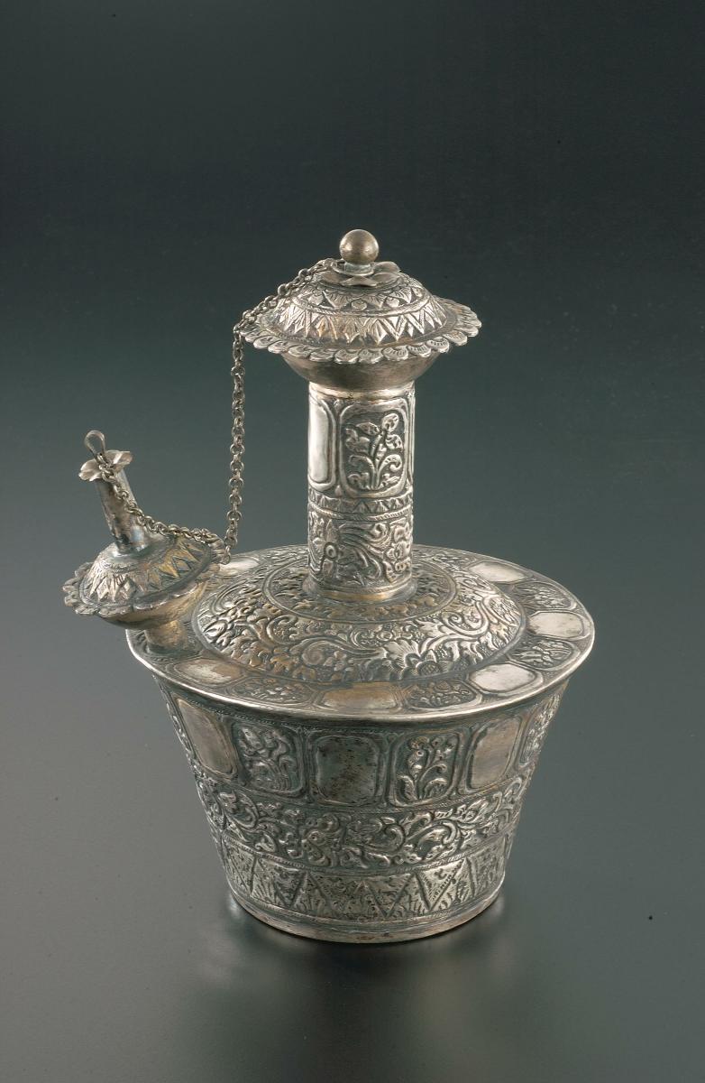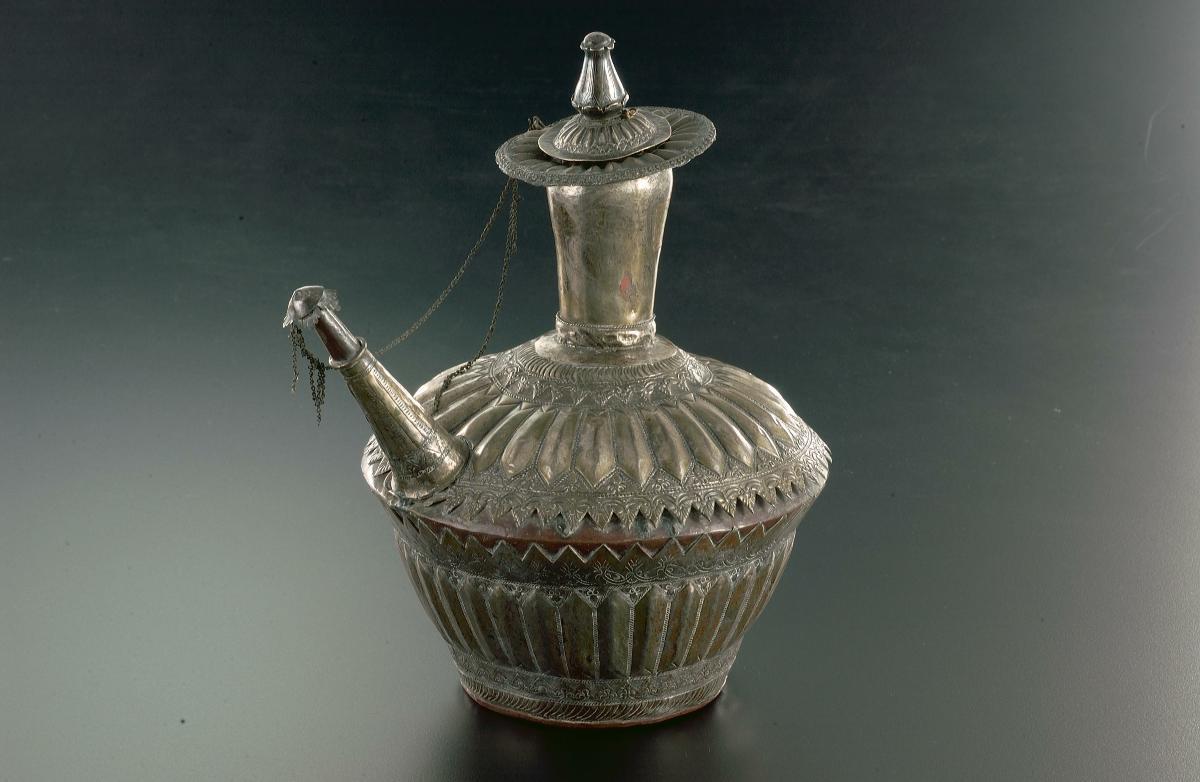 This 'kendi' has a lobed body of squat globular form. It has a mammiform spout with a circle-round handle which has triangular forms along its outer edge.The ‘kendi’ as it is known in Southeast Asia, was reproduced in metal and ceramics in many parts of the region. The name comes from the ancient Sanskrit name for water vessel and it is generally believed that the Southeast Asian ‘kendi’ developed from the Indian ‘kundika’. A typical kendi has a bulbous body, a neck which is used for holding the vessel and a spout. It was used for a wide range of purposes in addition to their primary function as a pouring and drinking vessel. It was also important as a ritual pouring vessel used in weddings and other ceremonies.