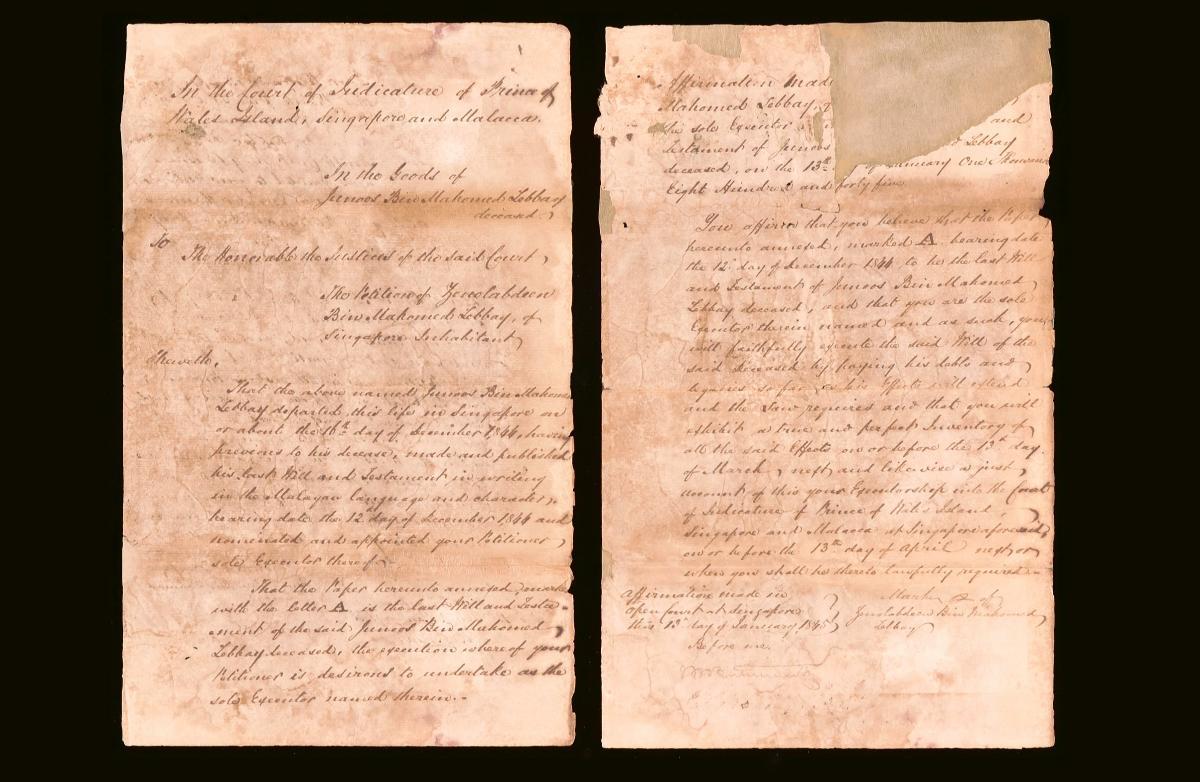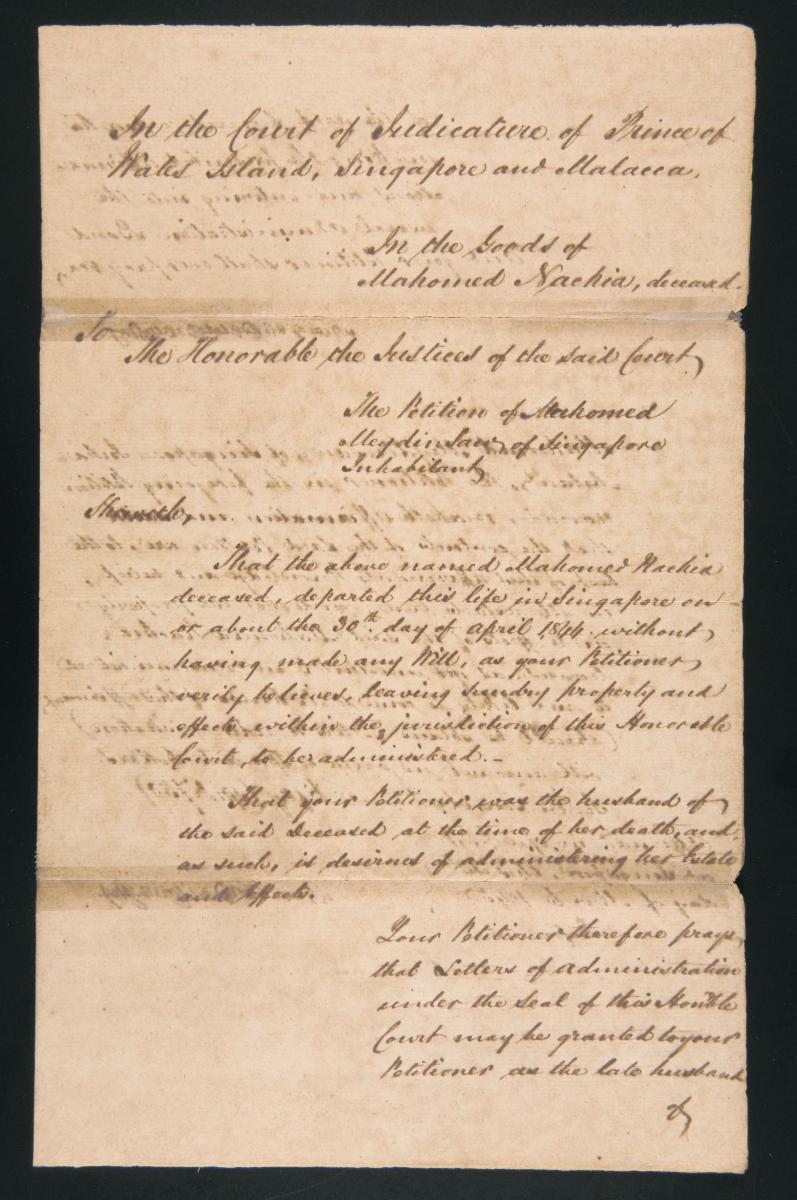 This is the petition of Kalandar and Sayed of Singapore, the duly constituted attorneys of Veesavoo Nacha, concerning the administration of the estate of her deceased husband, Chinma Tomby. This document is part of a collection of legal documents from the 19th and early 20th centuries which provides a glimpse into the work of the notable personalities who left their mark on Singapore’s legal history, and the economic and other transactions undertaken by ordinary immigrants in 19th century Singapore that tell stories of misfortune and indebtedness which would otherwise have disappeared from history.