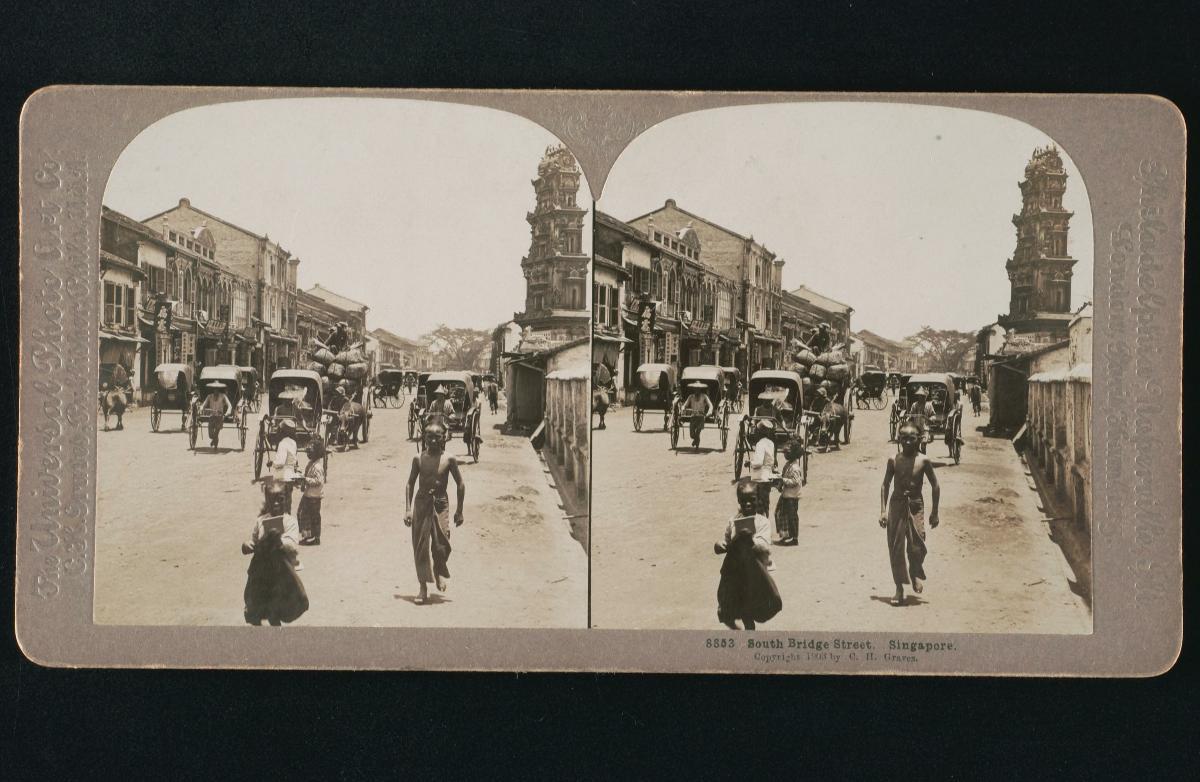 The postcard depicts a view along South Bridge Road. Built between 1827 and 1843 by Naraina Pillay, a Hindu trader from Penang, the Sri Mariamman temple with its ornate gate tower or ‘gopuram’ is on the left. In the background, the twin minarets of the Jamae Mosque can be seen. It was also known as Chulia Mosque as it was built by Chulia Muslims from India's Coromandel Coast between 1830 and 1855.