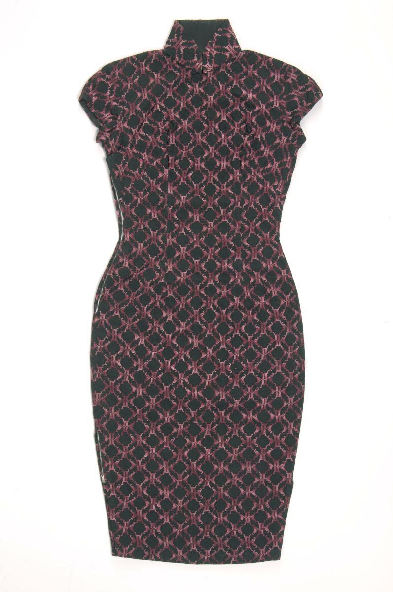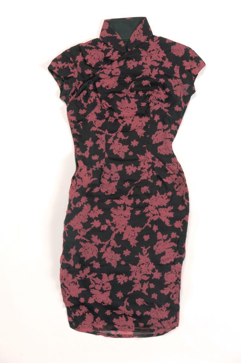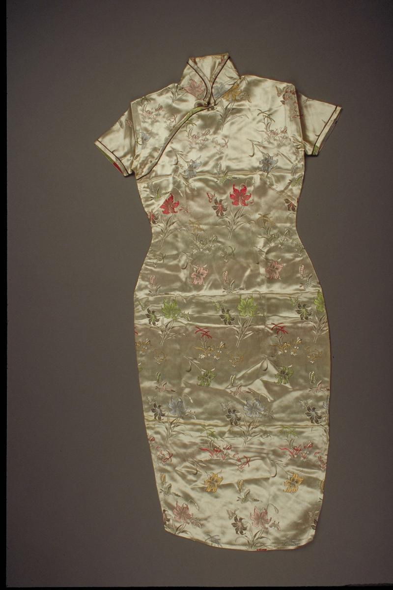 This is a short-sleeved, knee-length cheongsam with floral embroidery. The collar, sleeves, and flap on the right bodice have double black and red piping, which contrasts the overall fabric. A figure-hugging piece, it was believed to be influenced by the nipped-in waist style of the 1950s introduced by the West. By then, the cheongsam was so popular that most women owned one, although there were differences in fabric and style. This type of cheongsam was worn for formal occasions or parties right up to the 1960s.