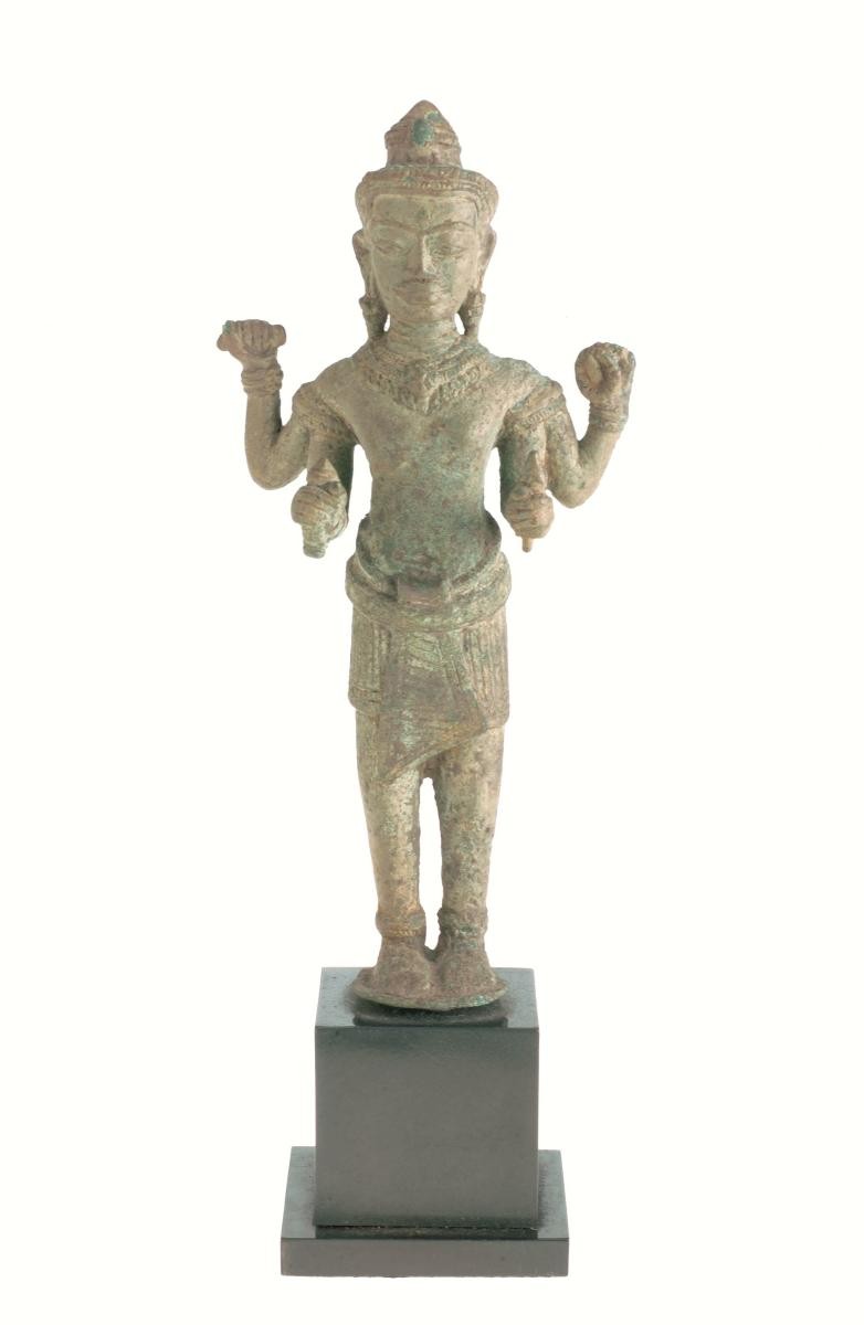 The finely cast gilt bronze figure shows a crowned 'bodhisattva' seated in 'dhyanasana' (meditation posture) on a lotus base, with her primary hands in 'anjalimudra' (palms sofly held together in a gesture of reverence). Her secondary hands held at the shoulder, carries a rosary in one and a lotus flower in the other. Her hair worn in knotted plaits, is painted blue. She is adorned with large pendant earrings and wears a long billowing scarf. This work is representative of a group of Buddhist figures made in China during the reign of the Yongle emperor (1403-1424). Influenced by Tibetan art, it was probably made as a gift from the Ming emperor who sought to maintain good relations with the Tibetan religious authorities.