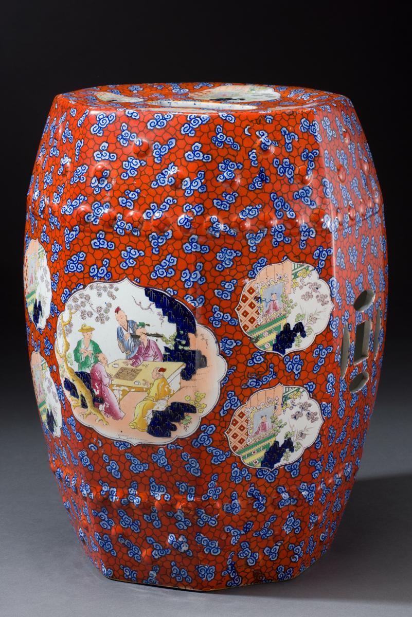 This large barrel-shaped 'fahua' garden seat is covered in blue and turquoise glazes. The double walls are elaborately decorated with pierced, carved openwork. The central section has two large moulded lion mask handles and cloud motifs set against the openwork floral background enclosed within the studded bands. The term fahua refers to alkaline-glazed earthenwares with striking decorations in deep blue, turquoise, purple, green, yellow and white colours. Produced from the 14th century onwards, fahua glazes became popular in Shanxi province in the north during the mid-15th century and spread to south China, at Jingdezhen. In fahua ware, a technique called slip-trailing is used before the application of the glazes. Designs are outlined by trails of slip (liquid clay) from a tube connected to a bag of slip paste then filled in with yellow, green and purple glazes applied within raised boundaries of background and designs before firing. As a result of these raised outlines, fahua wares have often been thought of as the ceramic version of the Chinese cloisonné.Fahua-type glazes were used to ornament a wide range of vessel types during the middle of the Ming dynasty including garden seats like this piece, wine jars, heavy flower pots and vases.