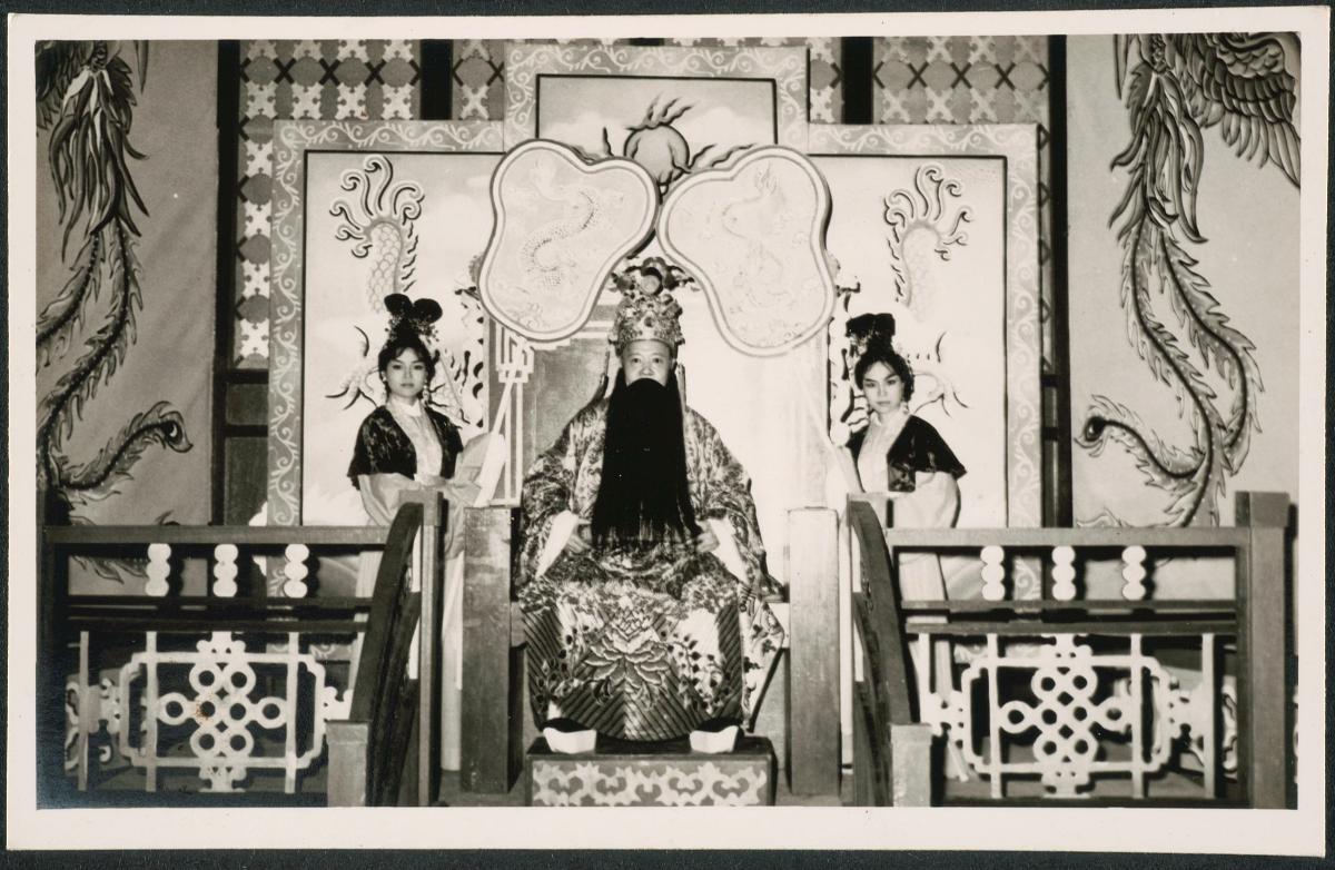 On the Chinese opera stage where scenery and props are few and far between, Chinese opera actors rely on stylised gestures to express a certain situation or event, as demonstrated by the actors in this photograph. Also known by the Malay term ‘wayang’, which means ‘performance’, Chinese opera in Singapore can be traced back to the 19th century with the arrival of Chinese immigrants. Up until the 1930s, wayang was a popular performing art, both as a platform for religious worship and as a cheap form of entertainment. In the background of this photograph, on the right hand side, one can see the wayang orchestra. The orchestra is an important part of the performance as it plays the music that is in perfect synchrony with every word, movement and gesture that is enacted. String, wind and percussion instruments usually make up the Chinese opera orchestra