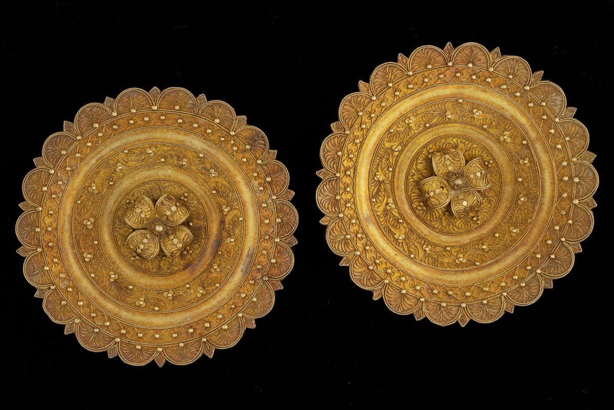 This display of disk-shaped ornaments highlights the ingenuity of Southeast Asian communities, as they encountered and absorbed a variety of cultural ideas through the long ebb and flow of their history. The beaten gold dishes and plates of Southeast Maluku boldly display emblems of beasts, plants and divine human figures. Communities that had adopted Islam, like the Bugis of South Sulawesi, however, softened these into stylised abstractions. New techniques of filigree, red staining and granulation lent a new intricacy to their ornaments.