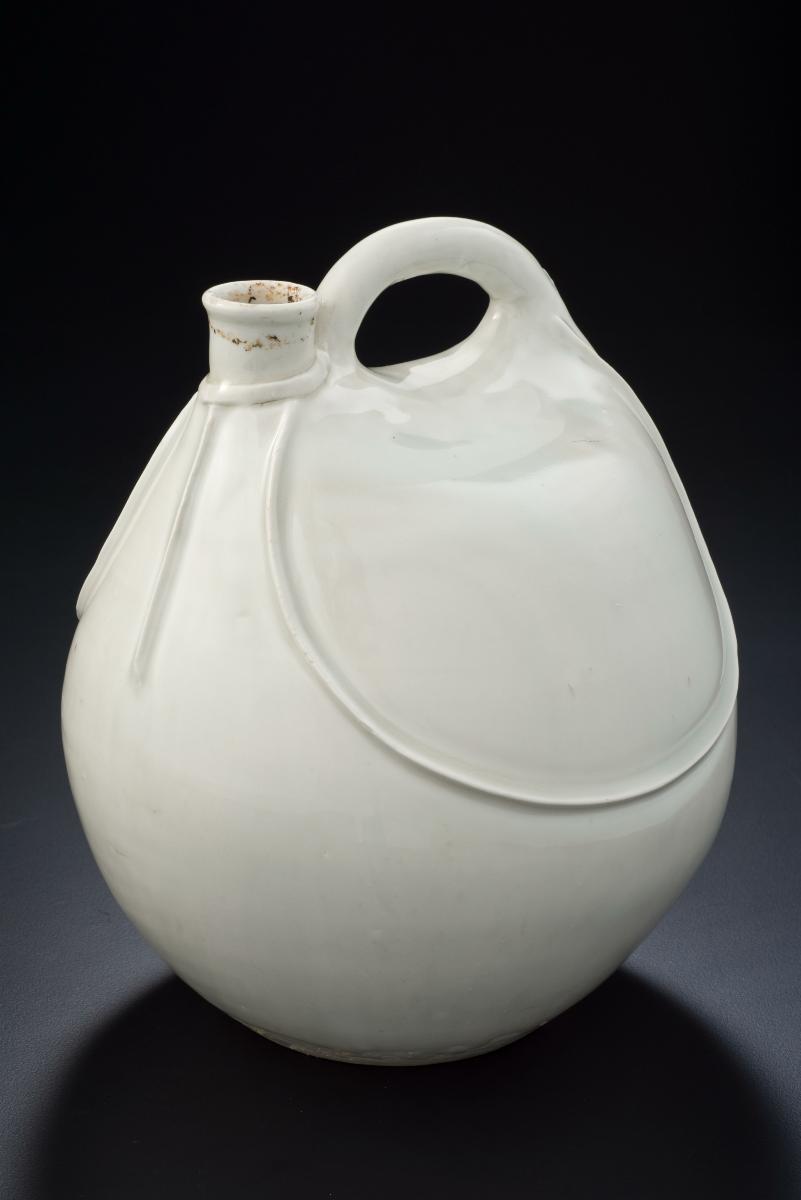 This globular jar has a cup-like mouth and lugs on the shoulder. It is decorated with streaky 'sancai' glazes that stop short of the foot. A large peony motif is carved at the centre.Lead glazes were introduced during the Han dynasty (206 BCE-220 CE) and were further developed during the Tang to include streaky ‘sancai’ (‘three-colour’) glazes of amber and green as depicted on these pieces.These pieces are made from moulds that are covered in lead glaze. During firing, colours in the glaze mingle with each other naturally to form vertical streaks. The streaky glazes originate from the colouring oxides present in the glazes. Copper oxide forms greens while iron oxide gives brown and yellow.