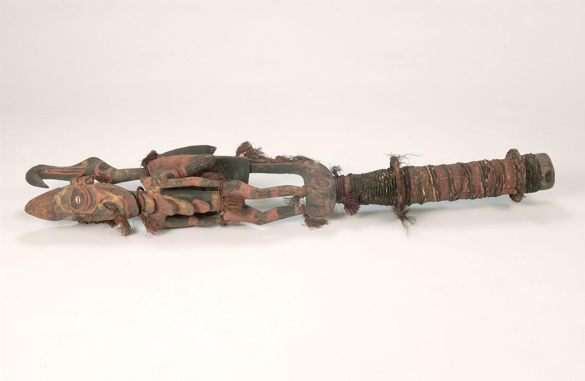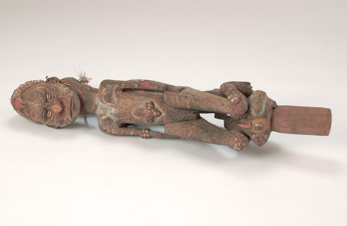 Magician-priests used wooden containers like this to hold ritual potions. A carving of a man riding a horse, with a Naga Muchalinda (a snake-like being) in a protective pose behind him, decorates the cover. The man on the horse is a popular Batak motif.