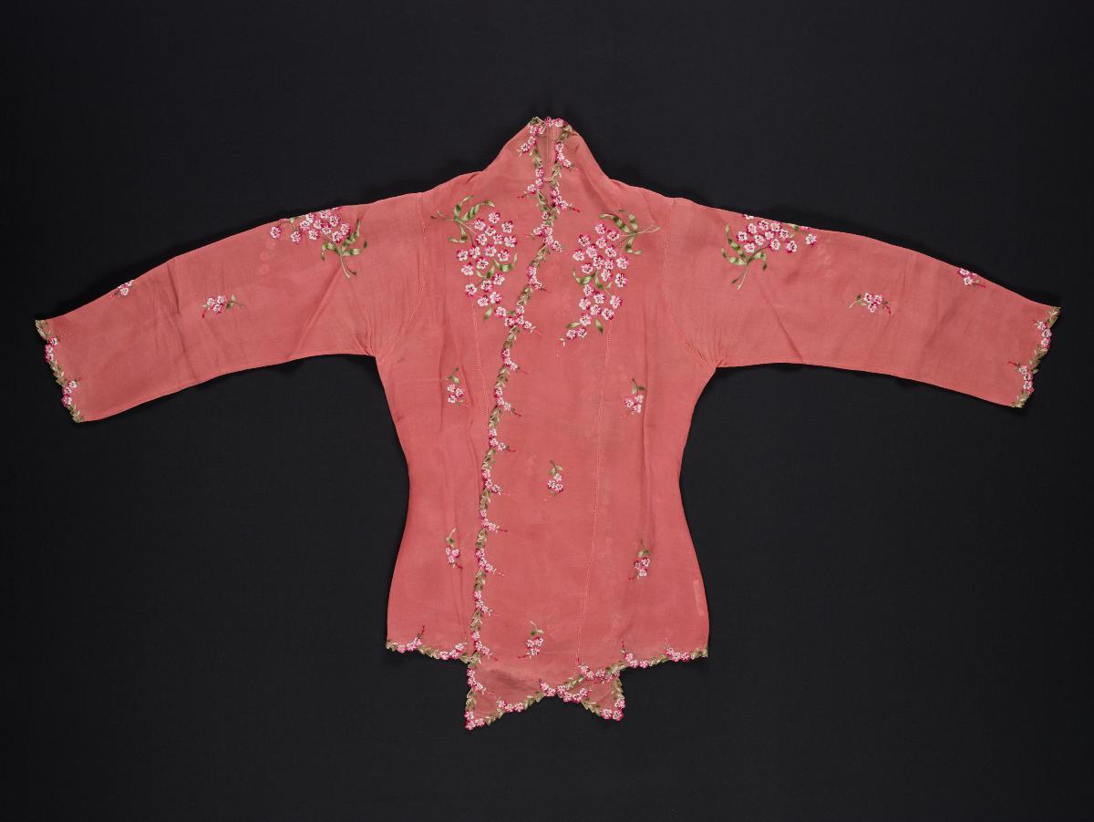 The 'kebaya biku' (which refers to a kebaya style with simple scalloped embroidery along the borders) has been used as everyday attire by Peranakan Chinese women since the 1930s. It is secured by three brooches and usually worn with a 'kain sarong' (waistcloth). The 'kebayas'' often incorporated stylised floral motifs especially the 'bunga raya' (or hibiscus) found in abundance in Singapore and the Federation. The Malays usually wore it with a corset, which helped to accentuate the wearer's slim figure. As the fabric was thin, women would wear camisoles underneath, until brassieres became popular in the 1950s.