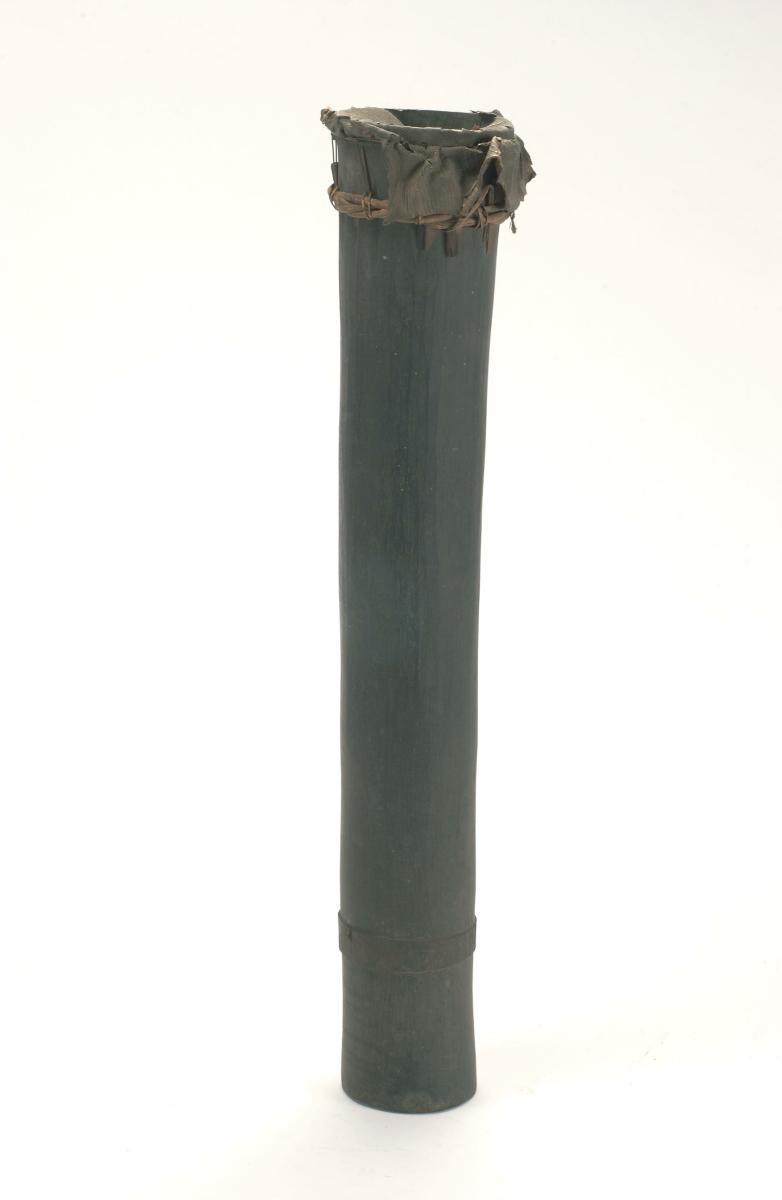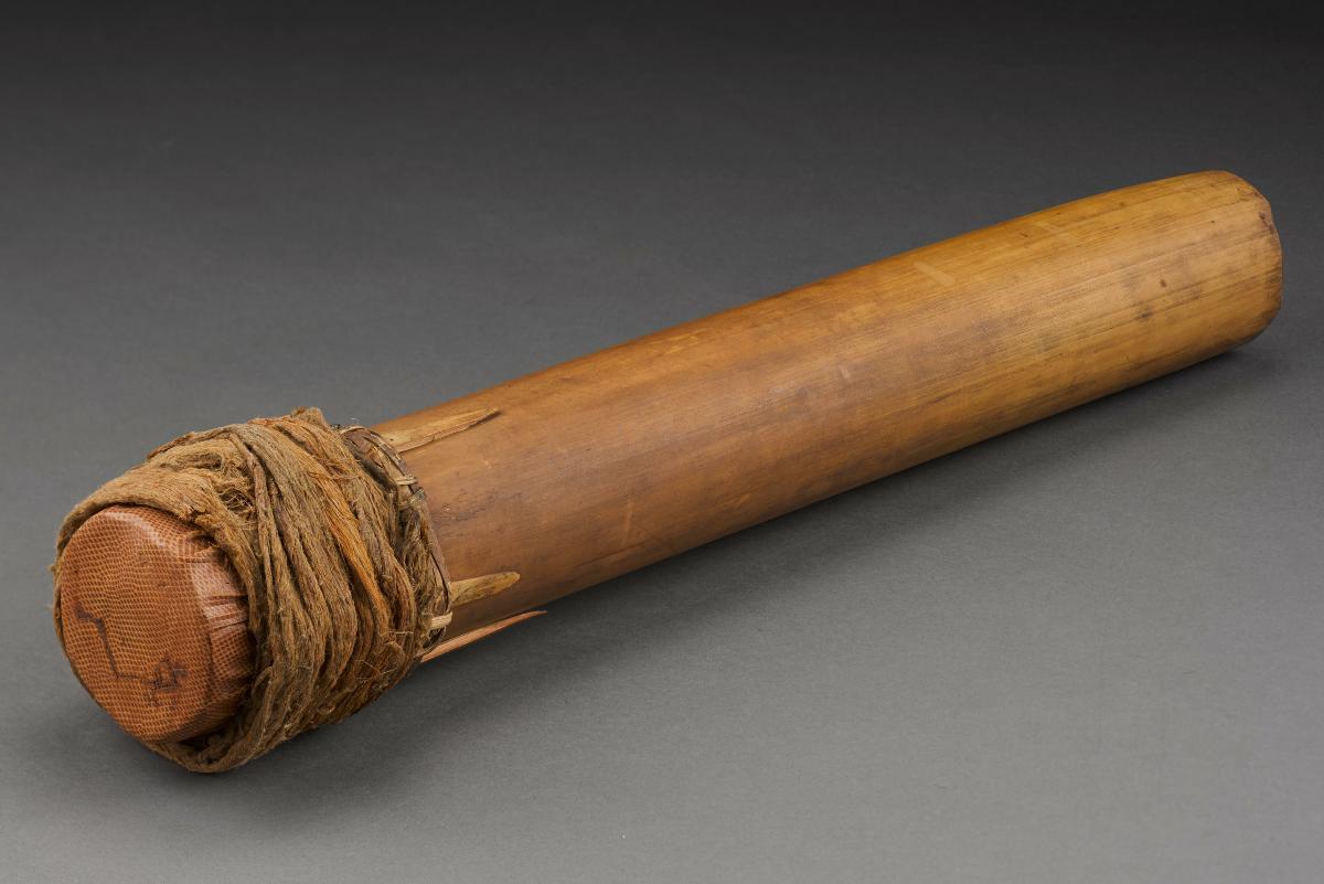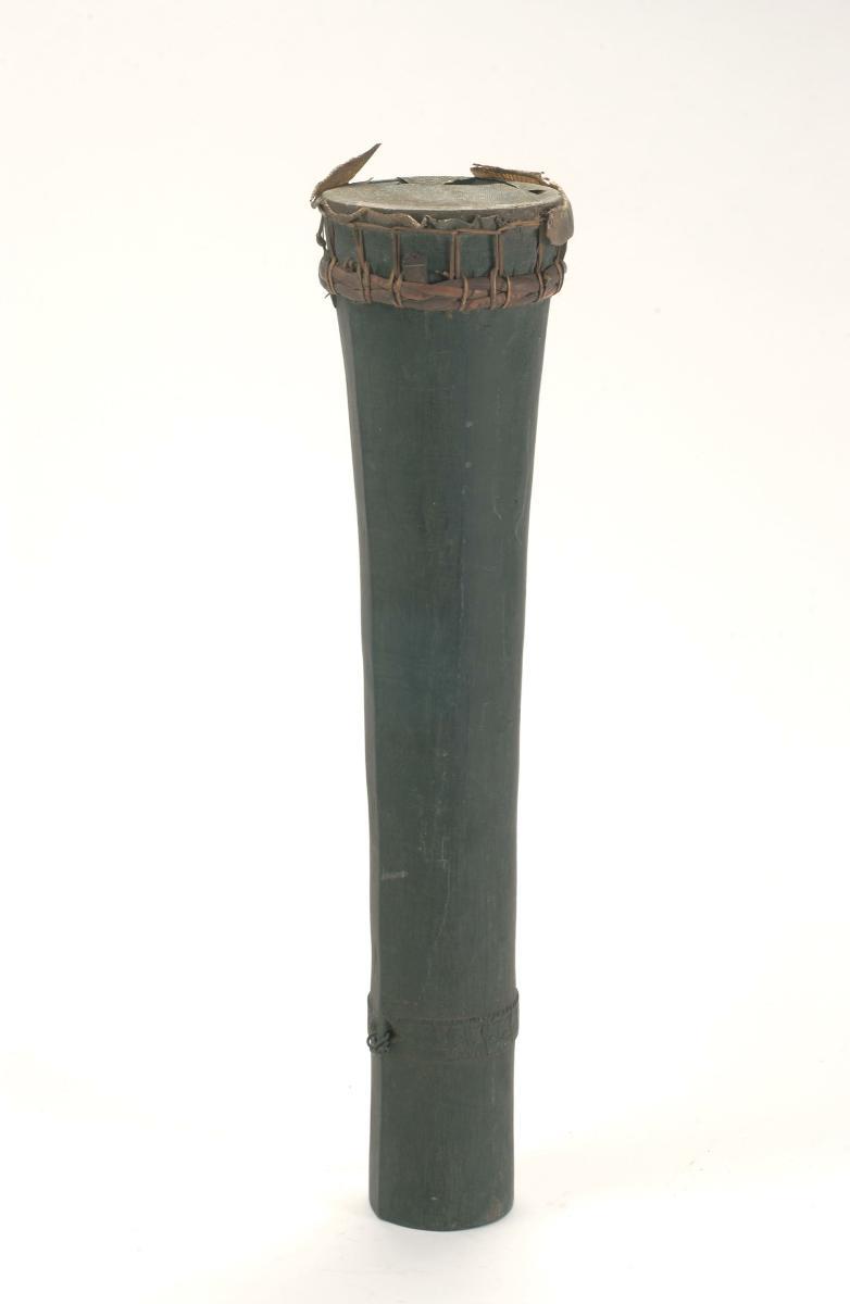 This Dayak drum made of a hollow, wood cylinder is constricted at the middle, open at one end and closed at the other with a sheet of deer-skin. It is stretched by rattan attached to its edges and extends to a stout rattan ring woven about the contricted middle of the drum. The skin is tightened by inserting wedges under this ring.