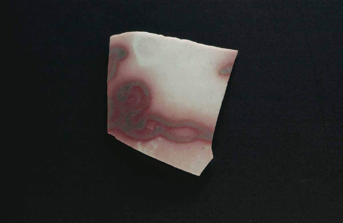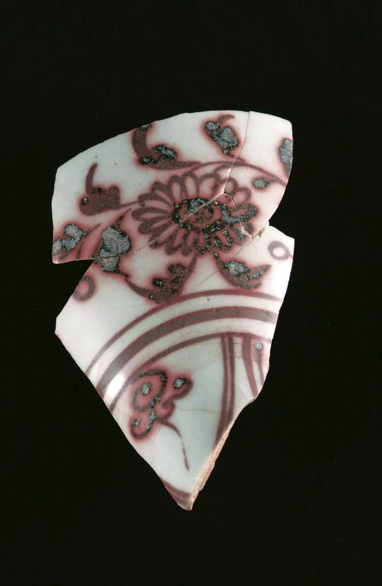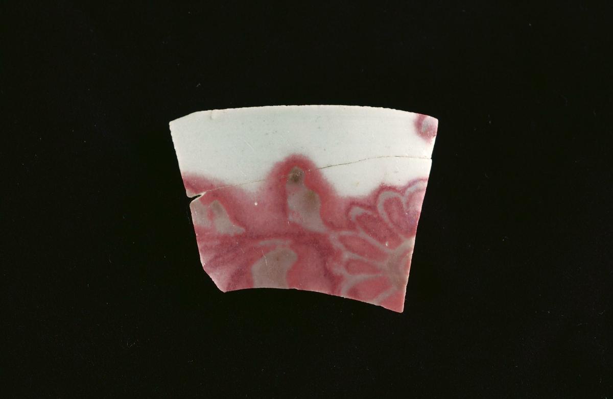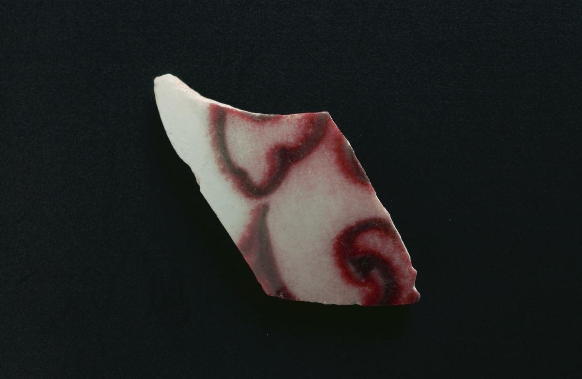 This shard belongs to a group of copper shards that was most likely pieces of vases, small jars and ewers. Their designs are roughly painted to include chrysanthemums and plantain leaf motifs, typical of 14th century porcelain ware of ancient China.The red tone is a result of painting with copper oxide under the glaze and firing in an oxidised atmosphere, where the kilns were rich in oxygen. Kiln atmospheres, glaze thickness, firing temperatures and cooling rates are key to obtaining a good red colour. Here, the uneven colours on the shards vary from bright red to reddish brown.