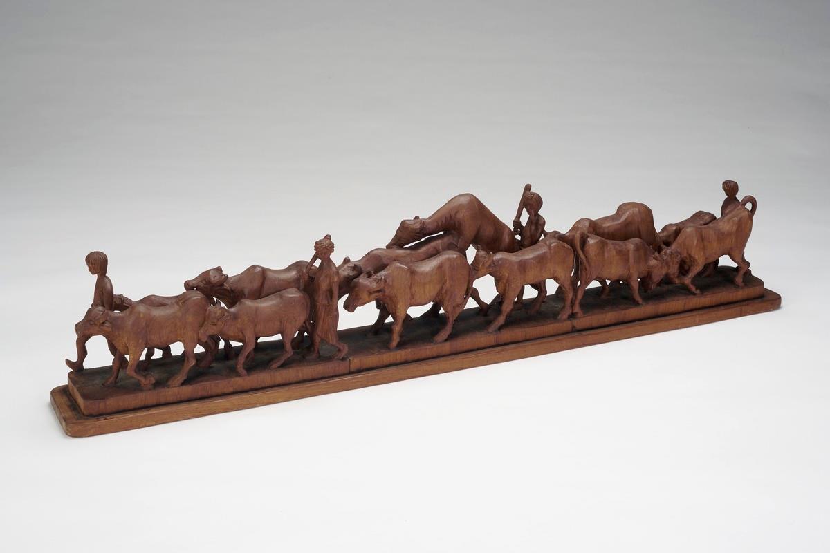 This grey pottery buffalo was a funerary item found in the tombs of ruling elite to provide for their afterlife. It has a series of incised lines on its neck. The horns and legs are applied separately. The harness appear as low relief. The custom of making ‘mingqi’ or burial wares was an ancient practice. Elaborate groups of burial wares were also a display of wealth and social status.