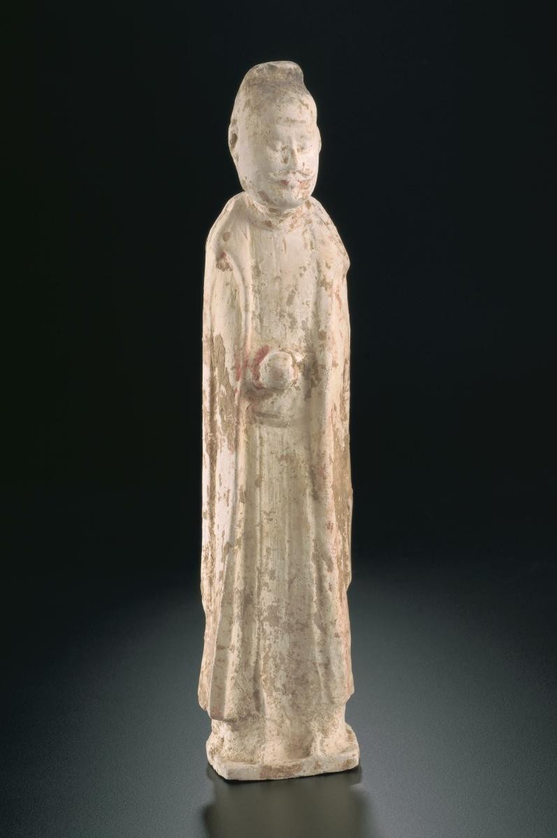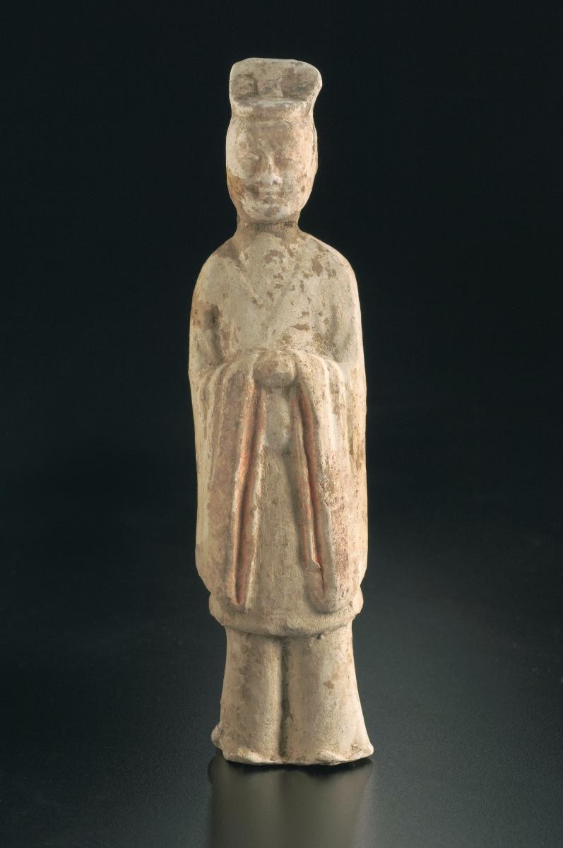 This terracotta figure of a civil official is portrayed wearing long robes with long flowing sleeves and its hands clasped together. It was part of a group of pottery tomb figures buried during the Tang dynasty. It would have stood as a pair at the entrance of the tomb chamber as it was thought to have the ability to ward off evil and protect the deceased, who was most likely a person of status. The custom of making burial wares or ‘mingqi’ was an ancient one. It is thought these wares were necessary for the deceased in the next world. Elaborate groups of burial wares were also a display of wealth and social status.