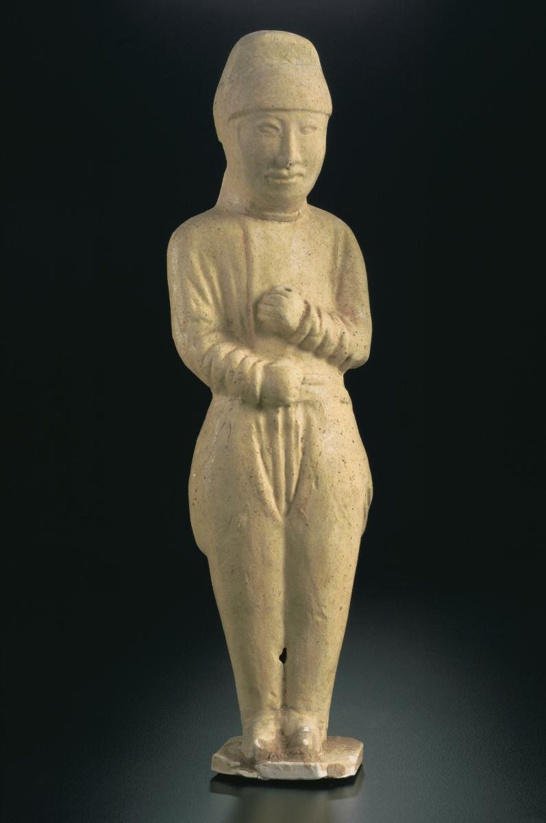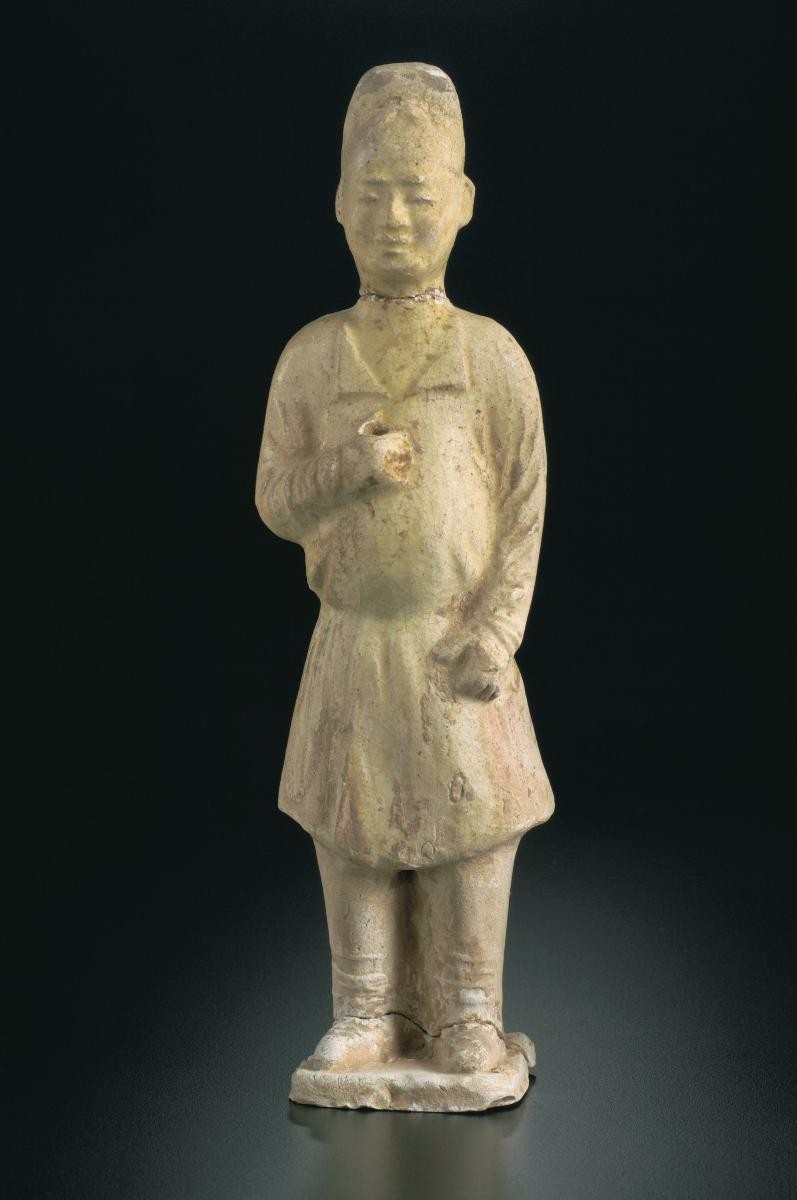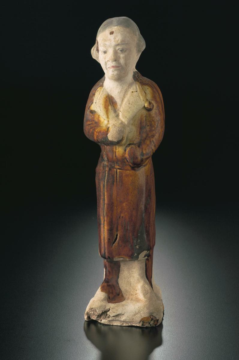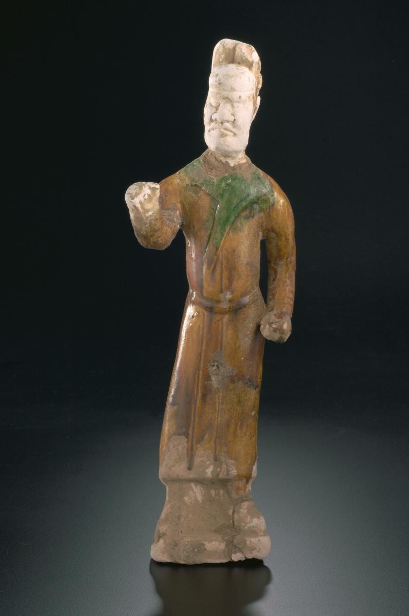 This earthenware groom is placed on a raised base, typical of pottery tomb figures buried during the Ming dynasty (1368-1644). It most likely came in a set with a horse. A green glaze covers the groom's robe which is adorned with a red belt. His hands appear to hold the rein which is now missing. The custom of making ‘mingqi’ or burial wares was an ancient one. It is thought these wares were necessary for the deceased in the next world. Elaborate groups of burial wares were also a display of wealth and social status.This figure would have been buried in the tomb of a man of status and wealth as the items that were buried were a reflection of the way he lived. It also reflects a desire to continue this comfortable way of life in the afterlife by burying models of his servants and horses with him.