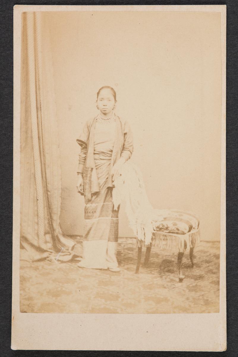 This is a studio photograph of a Malay woman. In this photo, the woman is wearing the ‘baju kurung’, a loose tunic over a sarong.