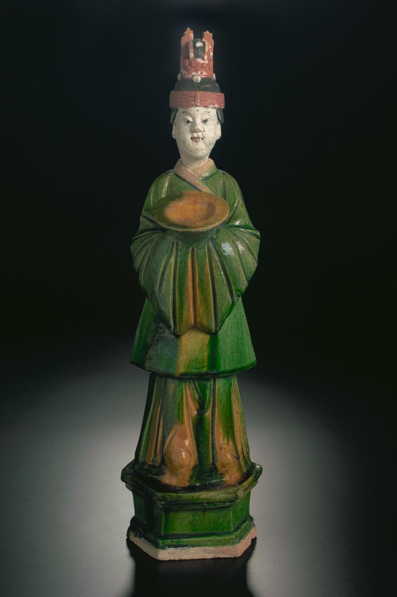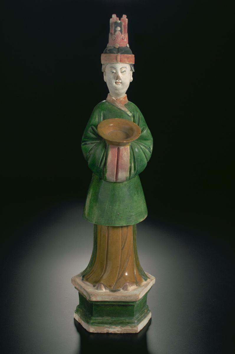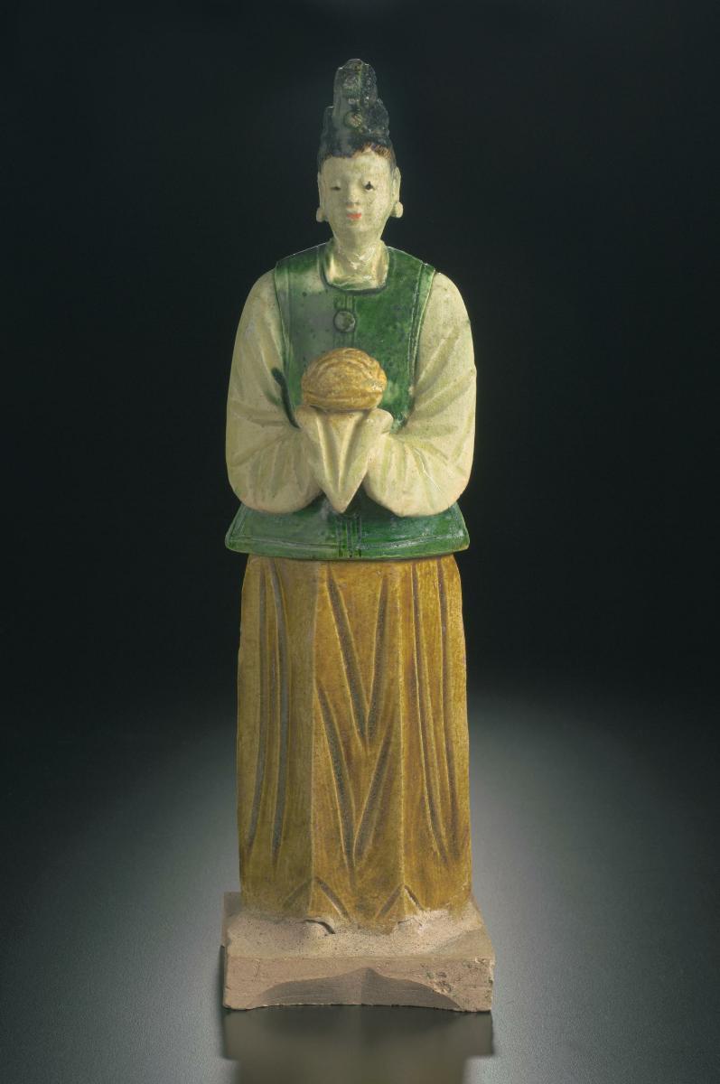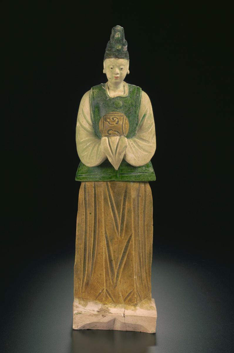 This grey pottery figure of a female attendant wears a long flared skirt and the typical long-sleeved wrap-over outer robe. The two holes cut into the sleeves were originally intended for the insertion of detachable hands, which are now missing. These hands would have probably held an offering. This figure from the Han dynasty served as a burial ware or ‘ming qi’.The custom of making ‘mingqi’ was an ancient one. It is thought these wares were necessary for the deceased in the next world. Elaborate groups of burial wares were also a display of wealth and social status.