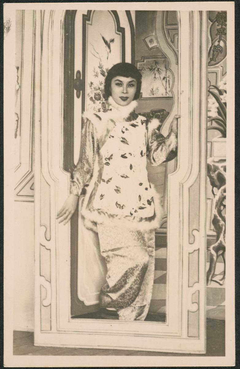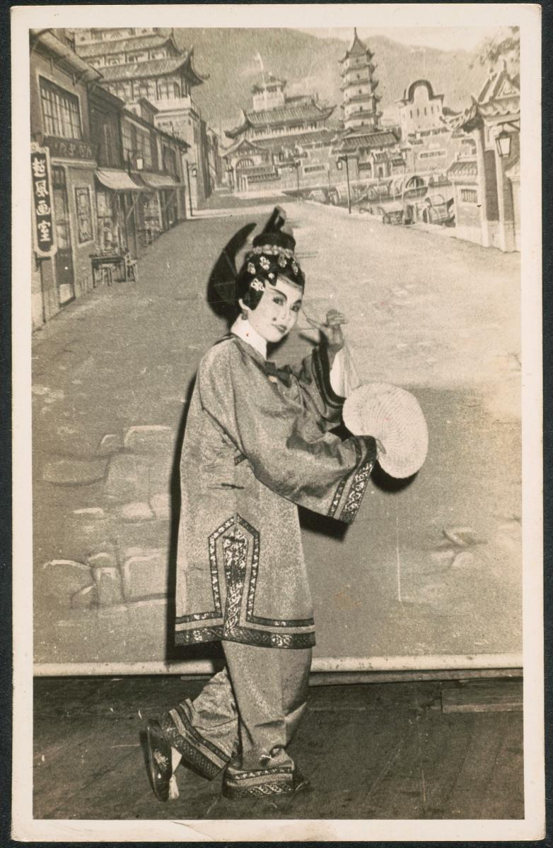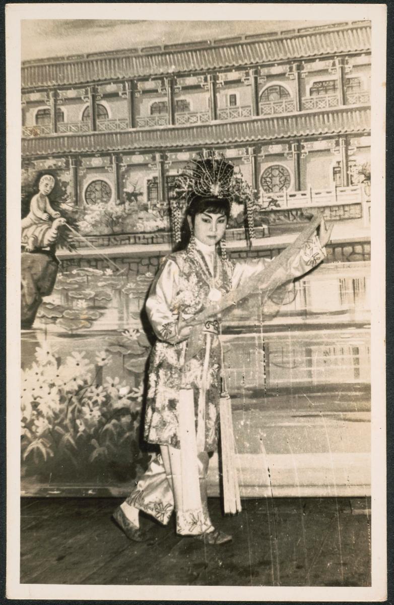 The actress depicted in this photograph is dressed as a ‘dan’ or female character, one of the four main roles enacted on the Chinese opera stage. Chinese opera costumes are typically decorated with intricate designs that indicate the age, traits and social status of the character. The headdress is another important element of the Chinese opera costume. Adorned with sequins, pearls and other ornaments, the headdress helps to distinguish specific roles; the more important the character, the more elaborate the headdress. The actress shown here wears a headdress featuring two long pheasant feathers which denote the sub-role of a ‘wu dan’ or female warrior. For a period of time, Chinese opera in Singapore went through a difficult phase with the arrival of silent movies in the 1920s, the Japanese Occupation and a depressed economy in the 1950s. Nonetheless, it made a comeback in the decades thereafter, following the influx of fresh ideas from overseas troupes, while opera-themed movies revived interest in the performing art.