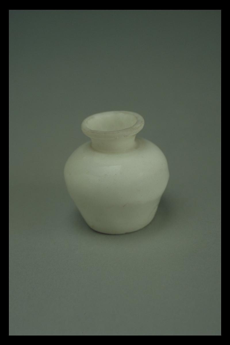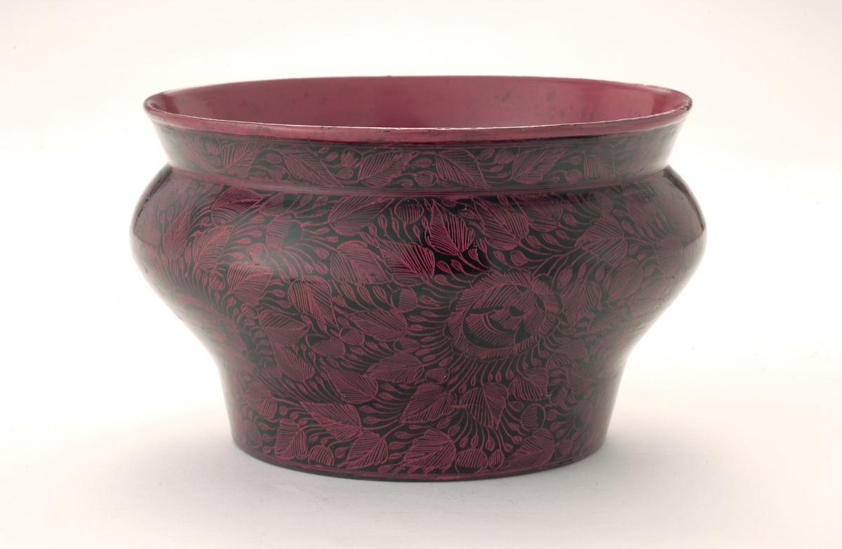 This jar of baluster form has a wide flanged mouth, tubular neck and an ovoid body that tapers to a pedestal foot. Covered unevenly with a dark brown glaze, it is decorated with incised concentric circles and other patterns on the shoulder and the foot. Vessels of this type were probably used as a funerary jar.