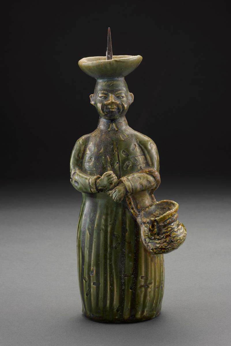 This pottery figure of a bearded man with tall hat is depicted as if holding something. It is thought to represent a foreigner, perhaps a merchant or groom who would have travelled to China on horse-back during the Tang period. This piece would have a part of a larger group of burial figures made for the tombs of the ruling elite.The custom of making ‘mingqi’ or burial wares was an ancient practice. It was believed that these wares were necessary for the deceased in the next world. Large groups of attendants and other figures were also a display of wealth and social status.